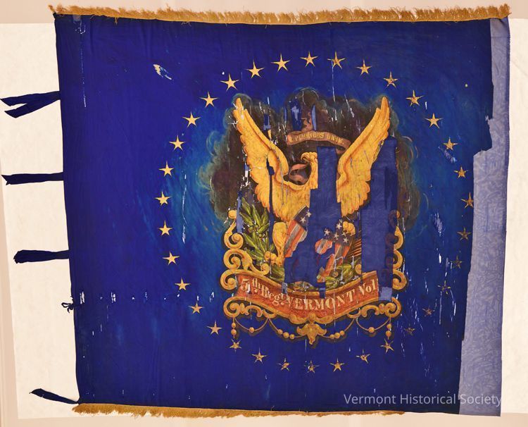 5th Regiment Infantry regimental flag. Attached to staff by ties. Fringe present. There are 34 gold painted stars arranged in a large circle, 4.5 inches on center, and 46 inch diameter. "5th Regt. Vermont Vols."