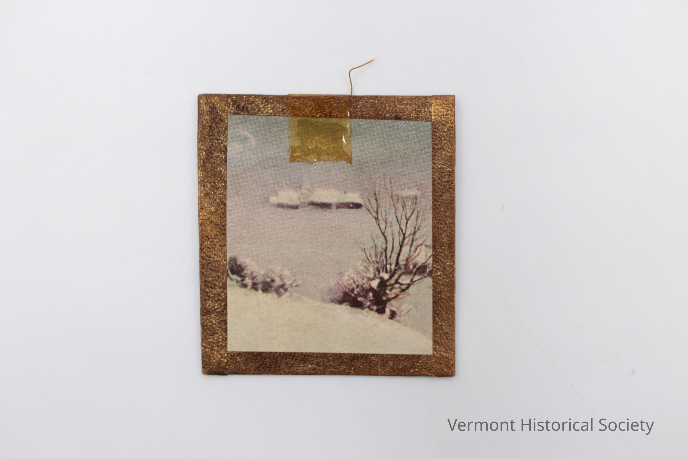 Miniature wall hanging sized for a dollhouse. The piece consists of a small print showing a snowy winter scene. The edges are bound with textured, metallic tape. There is a broken loop of gold thread at the top for hanging.Context
