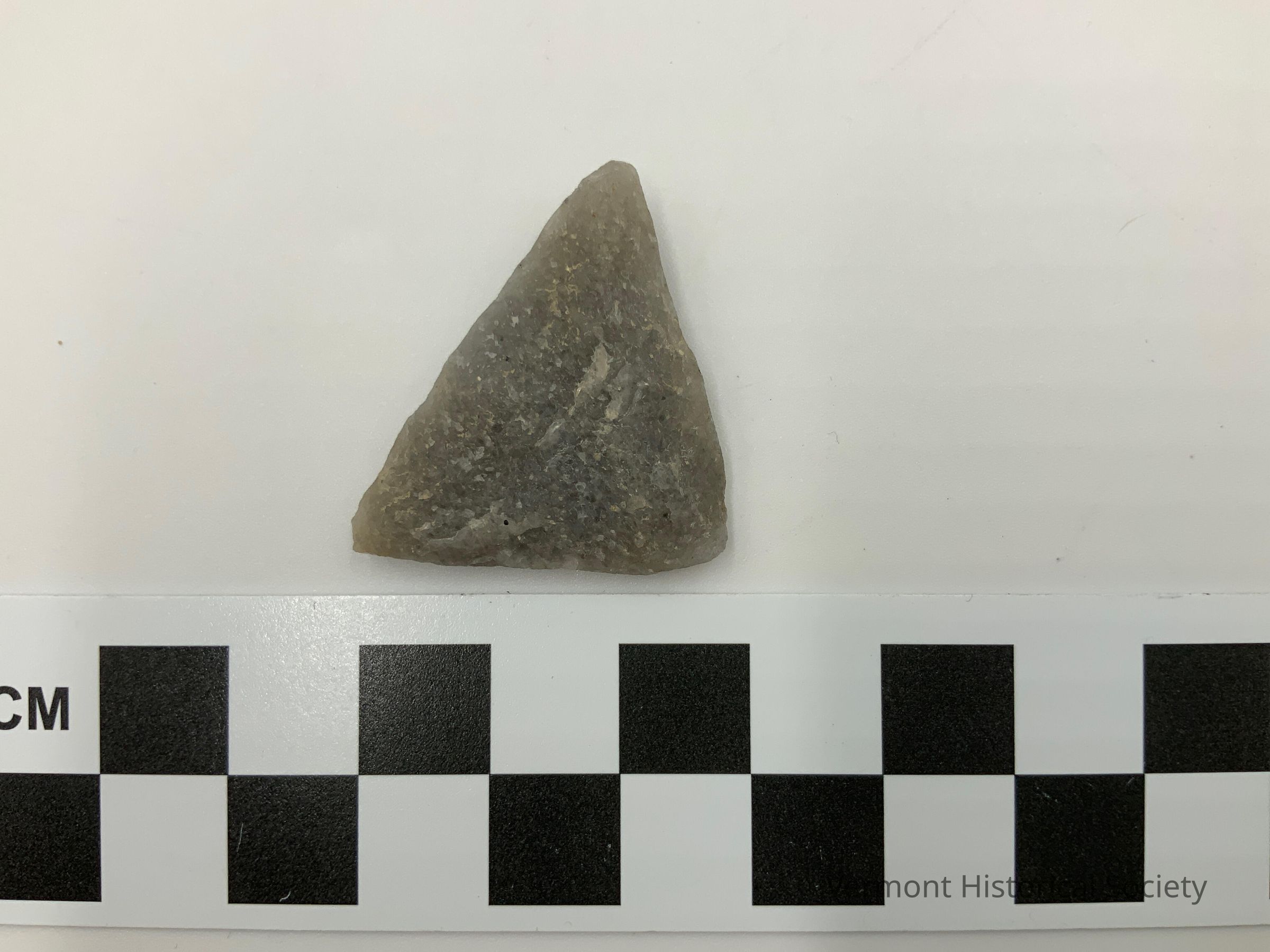 Triangular grey chipped stone projectile.