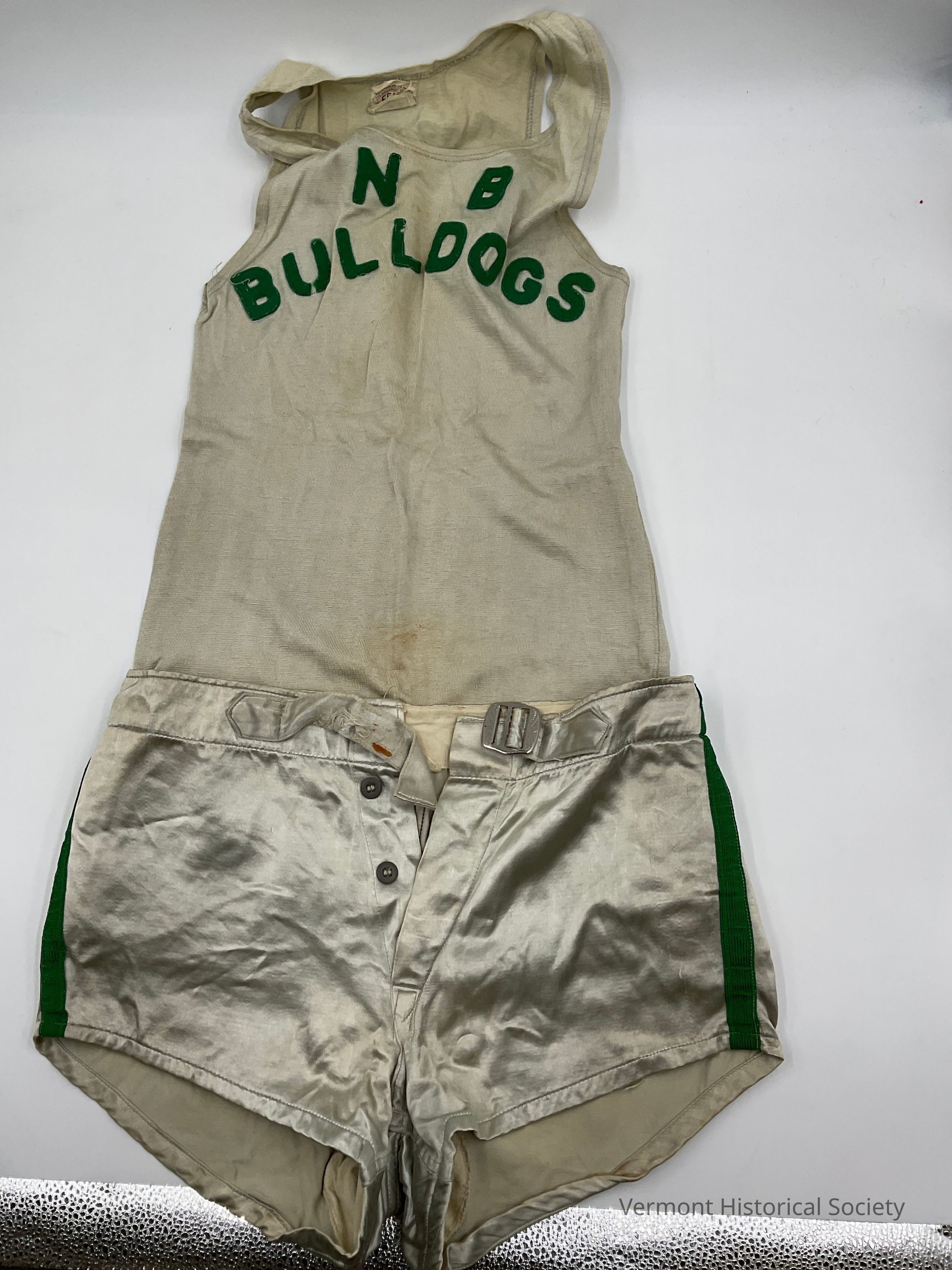 a = a silvery gray singlet with N B Bulldogs in green letters on one side and the number six in green on the back. the name "C. Rossi" is inked onto the hem at the bottom back of the shirt.