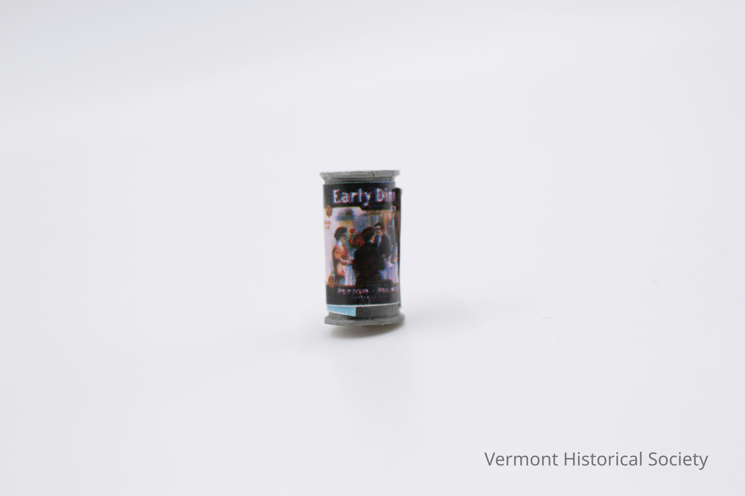 Miniature cylindrical food-storage can. The can is made of silver-colored plastic and is wrapped with a printed paper label. One side of the paper label shows a family at a dinner table with the words, "Early Dinner". The other side shows a white ear of corn with the words, "Early Dinner CORN".Context