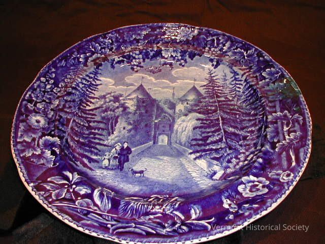 Blue-and-white transferware plate showing a scene of people and a dog walking on a bridge leading to a castle. The castle has two round towers, and the scene is flanked by tall evergreen trees. The border is printed with large flowers. A label on the back identifies the castle as the residence of Lafayette.