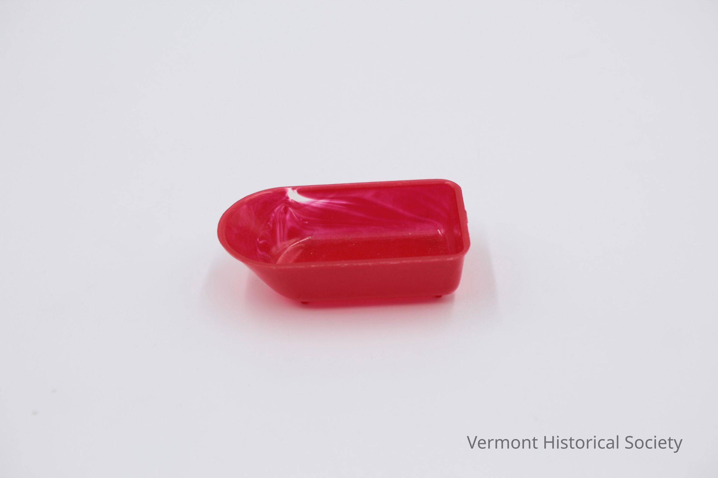 Miniature red plastic bathtub sized for a dollhouse. The plastic is slightly marbleized with one portion clear.Context