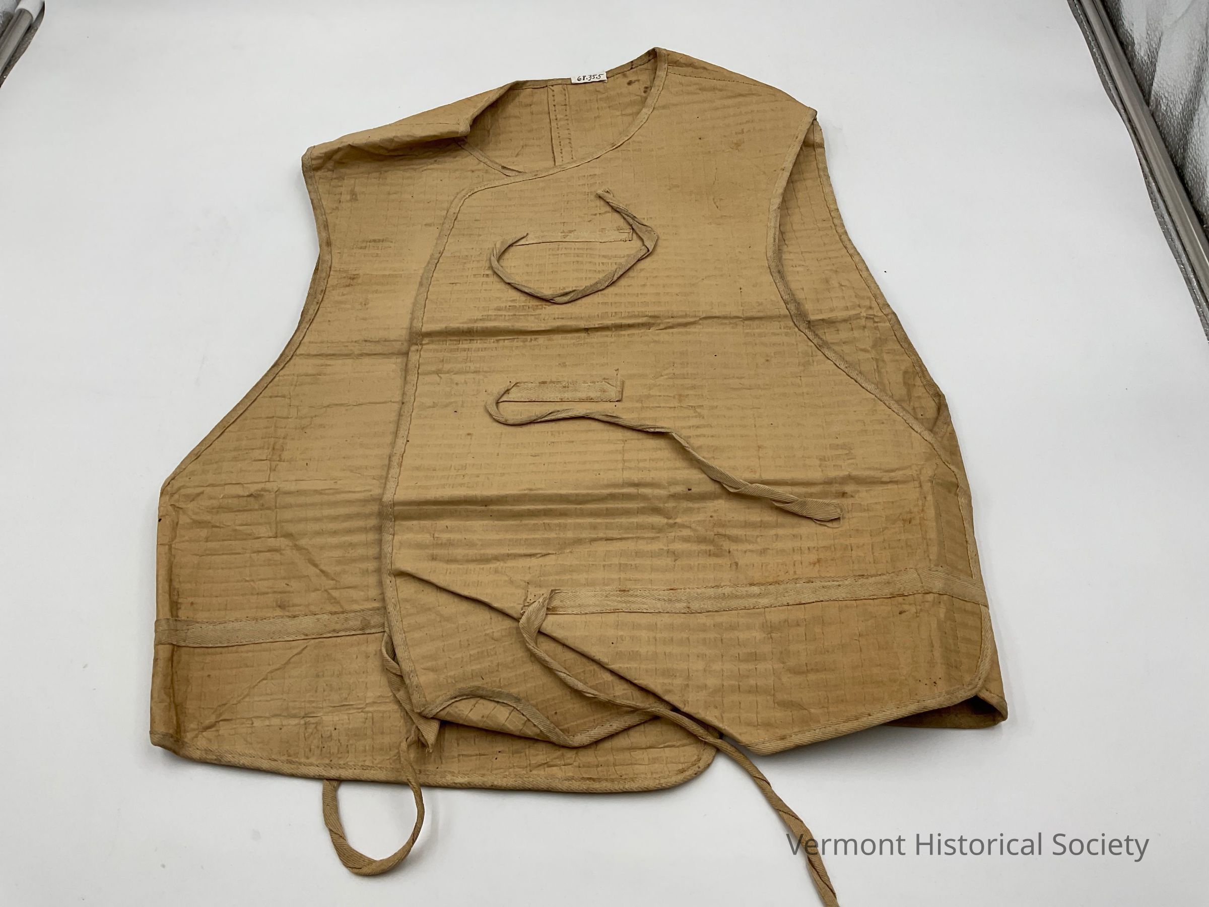 Man's vest made of paper. The vest consists of 4 panels: 2 back pieces, seamed at the center, and 2 front sides. Each front side has three lengths of twill tape stitched to it, which tie together to close the front of the vest. The bottom piece is stitched around to the back, where it can tie to adjust fit. The paper is made in variegated thickness in 2-way stripes, giving it a quilted or corded appearance. The edges are bound with twill tape. The interior back has a paper label printed with an image of a burning log, and the words, "New York Paper Clothing Mfg. Co. / 290 PEARL ST. NEW YORK. / Pat. Appl'd For." The top corners are inked with the labels "No. A" and "Size 38".Context