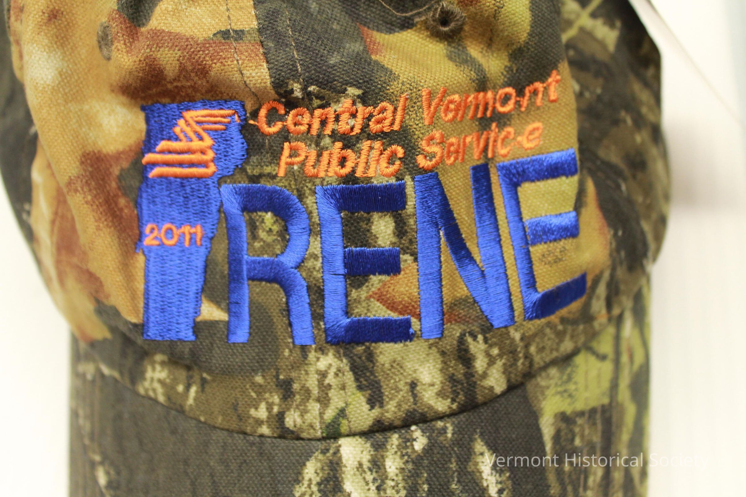 Baseball-type cap of camouflage cotton fabric. Embroidered on front above visor: "Central Vermont/ Public Service" with logo and "2011" in orange, and in blue, "Irene" with outline of state of Vermont replacing the letter "I" Attached to top of cap is a cardboard label for "MOSSY OAK', (brand name). Inside visor is paper label with bar code and order or serial numbers. Printed along inside band is maker "PORT AUTHORITY" with fabric content, etc. At back is a band with velcro tabs for expansion.