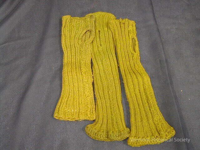 Olive green knitted wristlets with thumbholes. They are rib knitted.Context