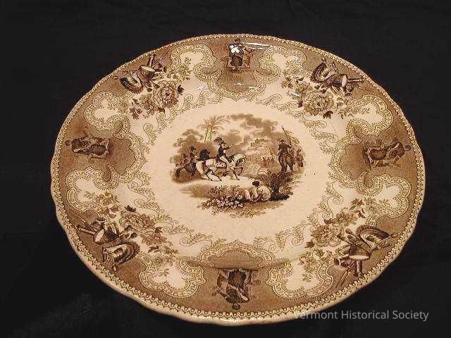 Black-and-white transfer-printed plate with a military design. The center shows a man on horseback in a tropical setting. The border contains repeating vignettes of a man in a toga and a grouping of instruments and weapons. The reverse is labeled, "TEXIAN CAMPAIGNE".