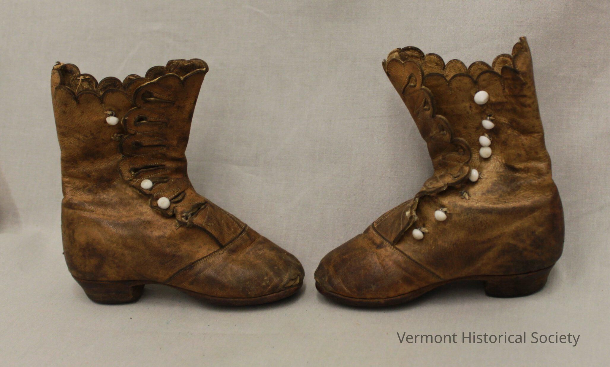 Brown leather child's boots. The shoes button up one side with 8 white buttons. The top edge is scalloped.