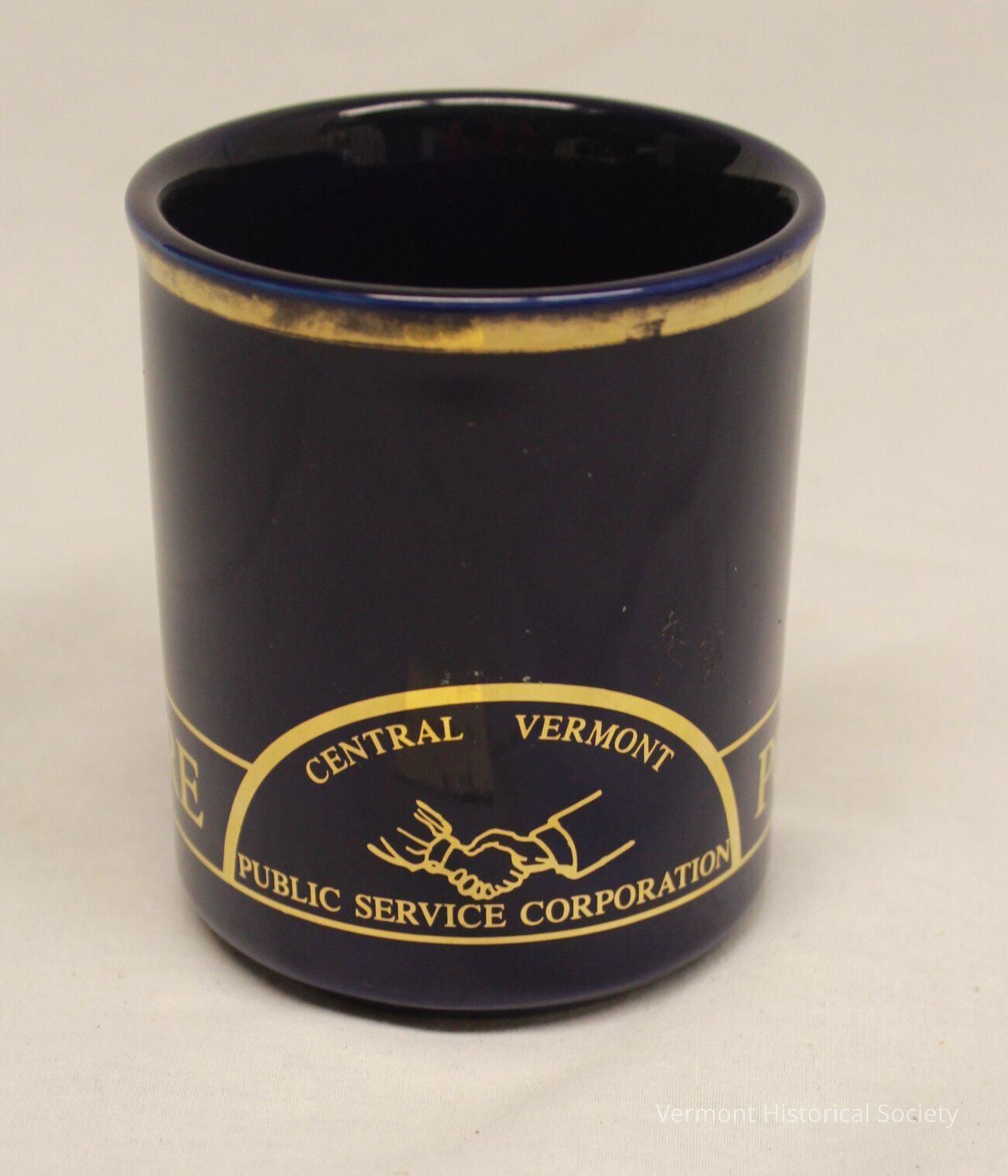Dark blue ceramic coffee mug decorated with gold. The gold decoration consists of a rectangle across the bottom of the mug that says "SHARE POWER" with a semicircle at the center with an illustration of two clasped hands and the words, "CENTRAL VERMONT PUBLIC SERVICE CORPORATION".