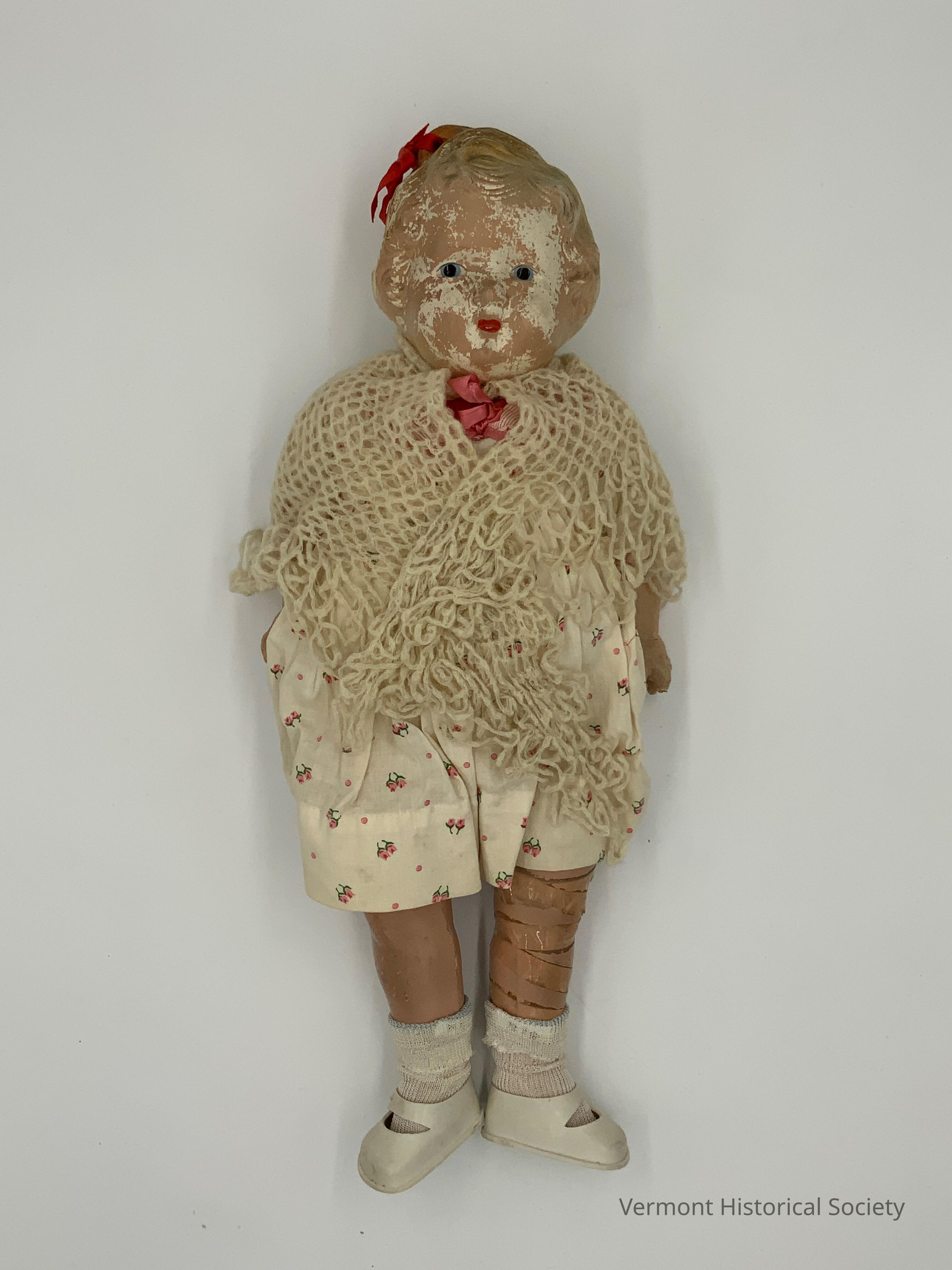 Composition doll with clothing. The doll has a molded face and hair, both of which are painted. There is a molded loop on the head through with a red ribbon is tied. The hair is painted blond. The eyes are painted blue, and the mouth is painted red. The doll is wearing a white cotton dress printed with pink flowers, bloomers, a shirt, a knitted shawl, socks, and white plastic shoes. One of the legs is split in half and repaired with clear tape.Context