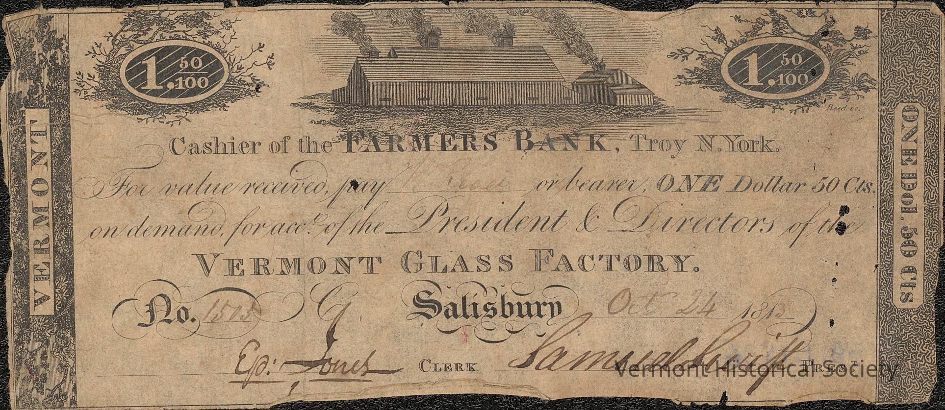 Private bank note for 1 dollar and 50 cents issued by Farmers Bank on behalf of the Vermont Glass Factory. It is printed with the inscription, "Cashier of the Farmers Bank, Troy, N. York. For value received, pay [W. Reed] or bearer ONE Dollar 50 Cts. on demand for account of the President & Directors of the VERMONT GLASS FACTORY. No. [1505] B SALISBURY, [Oct 24] 181[3] [Ep: Jones] CLERK. [Samuel Swift] PRESIDENT."Acquisition