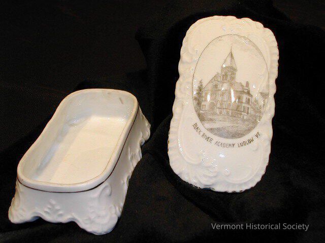 Rectangular trinket box with removable lid. Both the lid and the box are decoratively molded with swirls. The lid is printed with the image of a building with a prominent tower and the label, "BLACK RIVER ACADEMY, LUDLOW, VT." The bottom of the box is printed with the label, "MADE IN GERMANY FOR JOHN BARRETT LUDLOW VT."Context