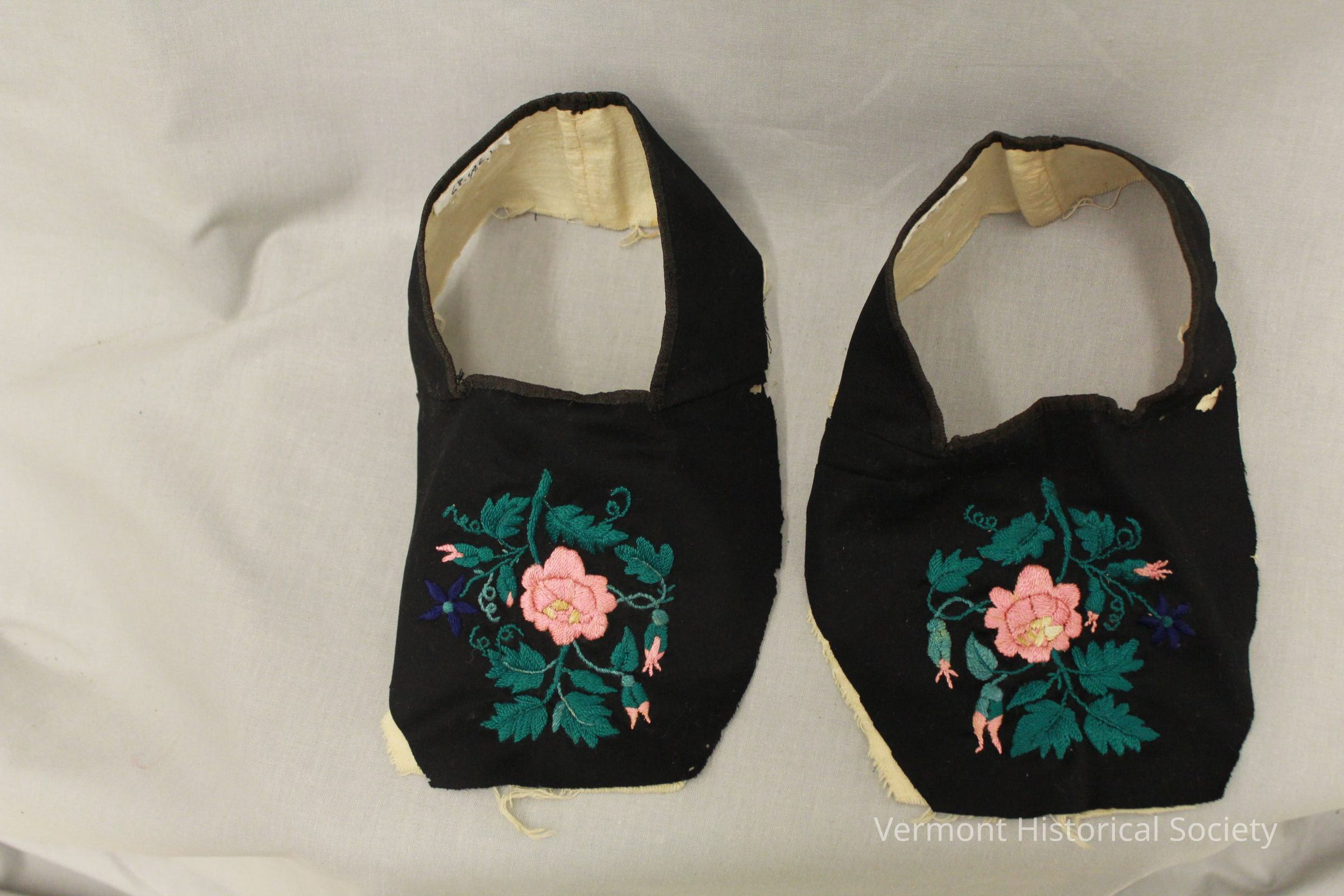Unfinished pair of slipper tops made from black wool and embroidered with blue and pink flowers as well as greenery. They are lined with undyed cotton on the inside.