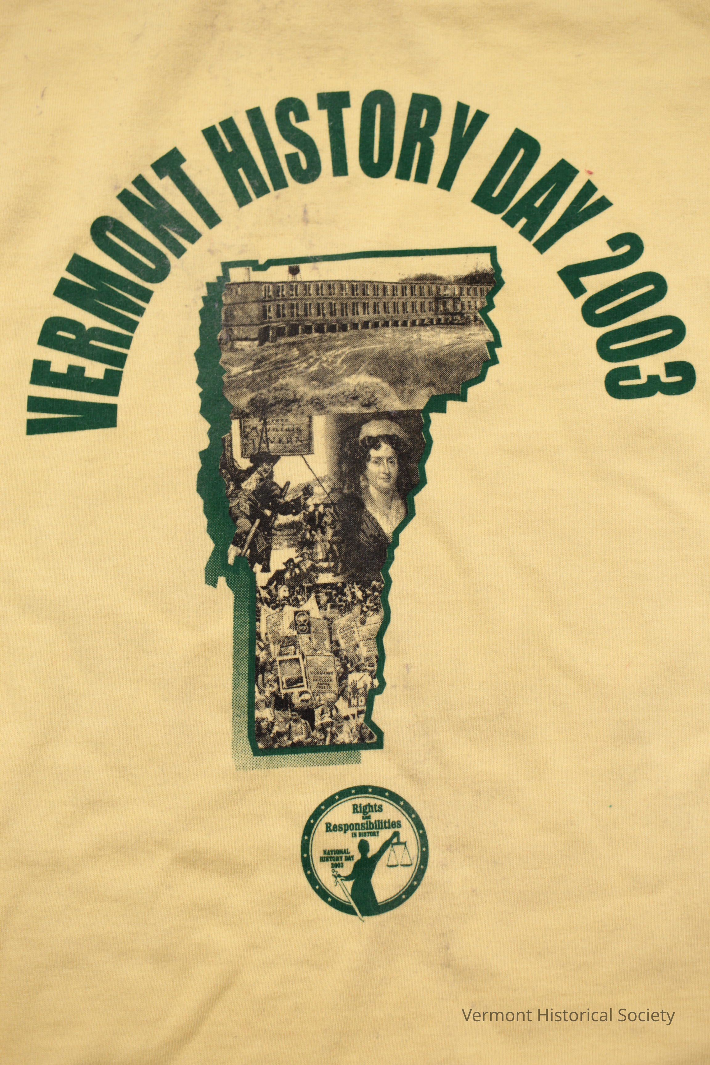 Yellow t-shirt printed in green with the words "VERMONT HISTORY DAY 2003" over an outline of the state of Vermont filled with black-and-white historical imagery. The images within the state outline are a flood, a woman's portrait, a man at the Catamount Tavern, and a protest. At the bottom is a circular logo that says, "Rights & Responsibilities in Vermont". The back is printed with the inscription, "Cargill Animal Nutrition A Proud Sponsor of Vermont History Day".Context