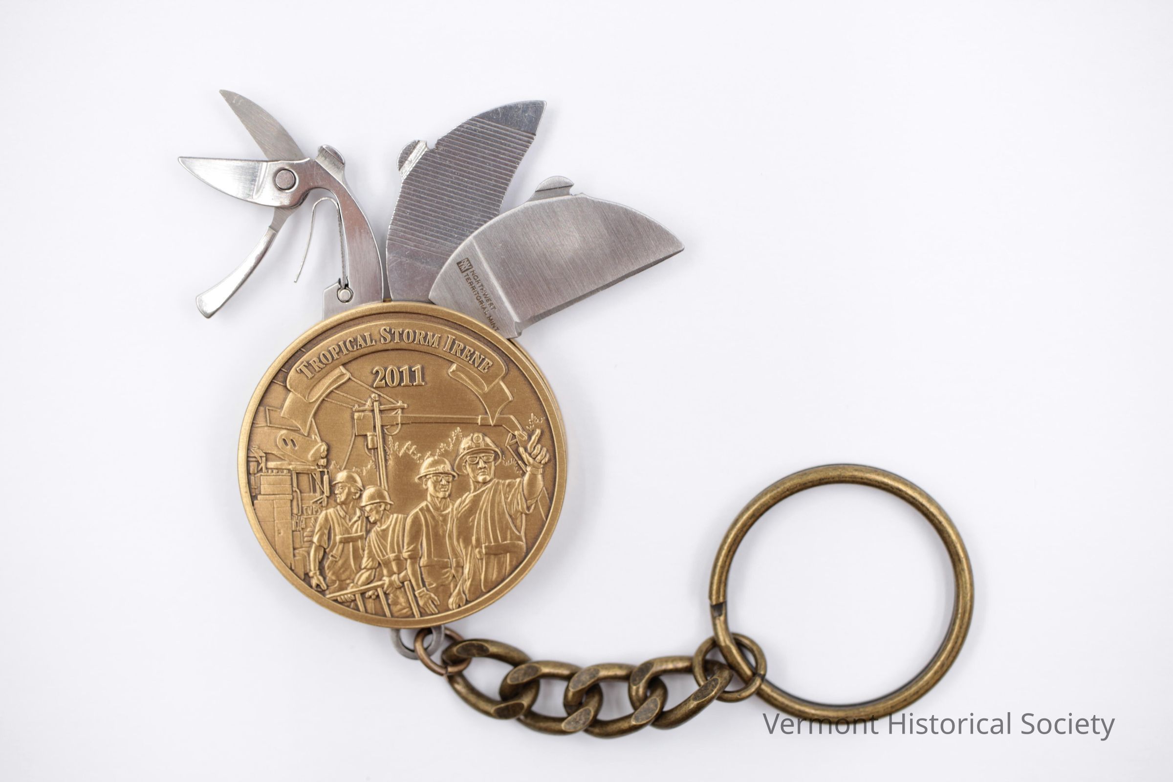 Key chain made up of two brass coins sandwiched together and holding a small knife, scissors and nail file, all curved. Engraved on one coin is "Central Vermont Public Service" with its logo and below that, - - EMERGENCY RECOVERY AWARD -- 2007 - 2008 - 2010 - 2011" Engraved on the other coin, "TROPICAL STORM IRENE/ 2011" with a scene of electrical workers in action. Attached to bottom of coins is a heavy chain and a key ring.