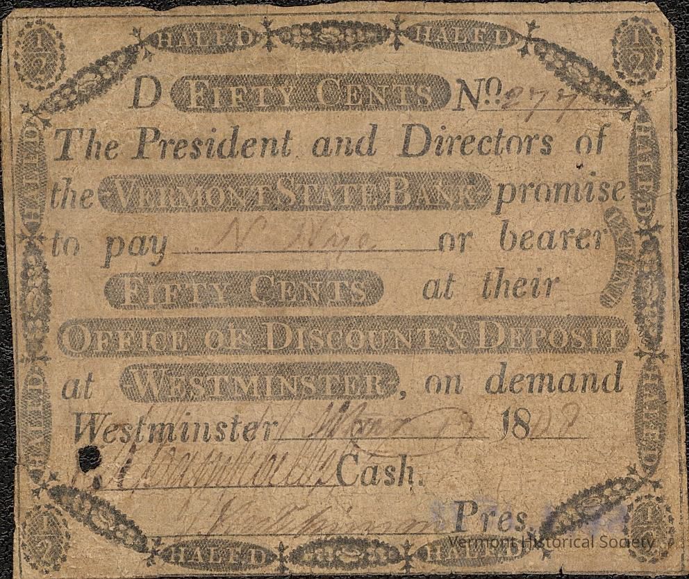 Private bank note for 50 cents from the Vermont State Bank. It is printed with the inscription, "D FIFTY CENTS No. [277] The President and Directors of the VERMONT STATE BANK promis to pay [N Nye] or bearer FIFTY CENTS at their OFFICE OF DISCOUNT & DEPOSIT at WESTMINSTER, on demand Westminster [Mar 17] 18[08] [illeg] Cash. [illeg] Pres."