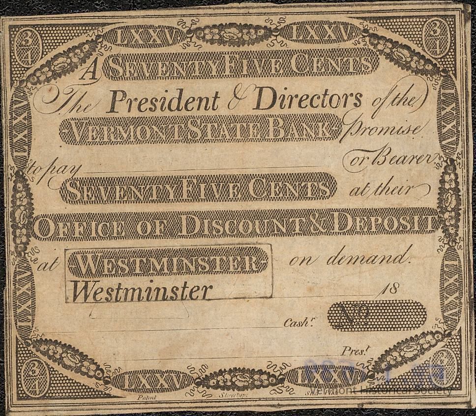 Private bank note for 75 cents from the Vermont State Bank. It is printed with the inscription, "A SEVENTY FIVE CENTS The President and Directors of the VERMONT STATE BANK promis to pay [blank] or bearer SEVENTY FIVE CENTS at their OFFICE OF DISCOUNT & DEPOSIT at WESTMINSTER Westminster, on demand Westminster [blank] 18[blank] [unsigned] Cash. [unsigned] Pres."
