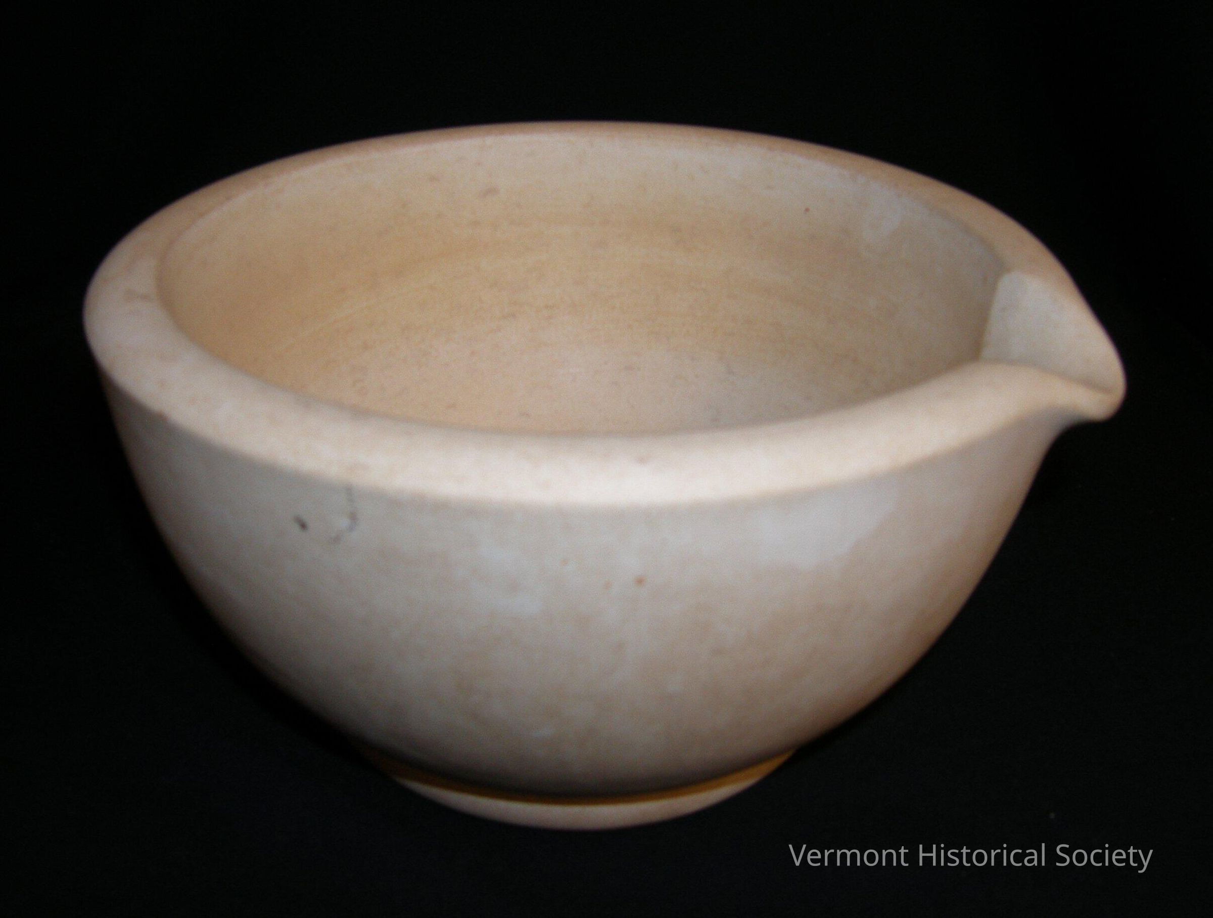 Heavy, unglazed ceramic mortar or mixing bowl with a pouring spout. There are two stamped marks on the bottom, both only partially visible.Context