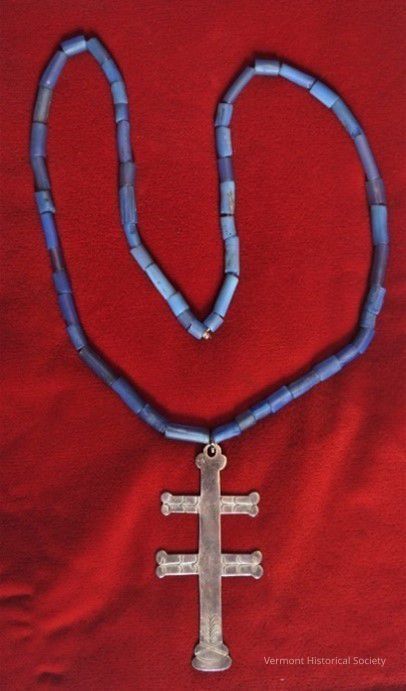 The Montreal cross from a family with Native ancestry was shared with the old Abenaki Research Project as proof of a native lineage. The ancestral line traces to Franklin County, VT. It is a classic example of a silver pendant, believed to represent the dragonfly to some native peoples. This example is beautifully crafted of thick silver sheet with minimal incising on the arms and base. It is unmarked. It is suspended from a coeval string of blue glass tubular beads but has been restrung on artificial sinew.