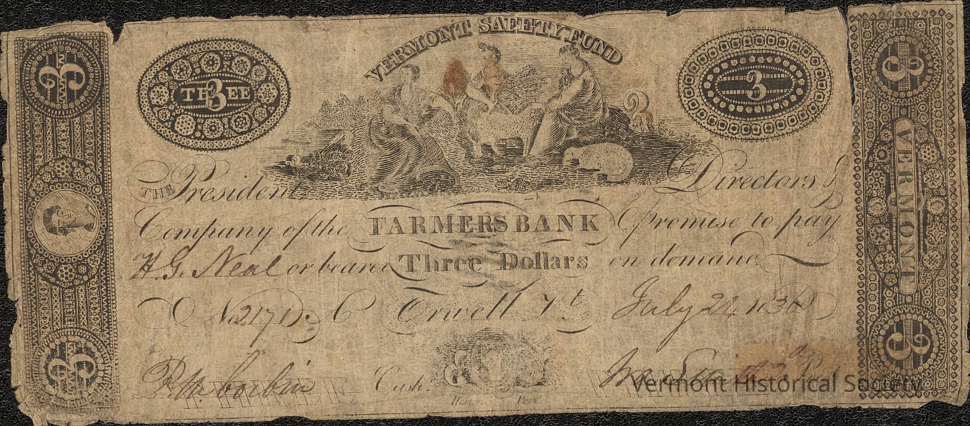Private bank note for 3 dollars from the Farmers Bank. It has the inscription, "The President Directors & Company of the FARMERS BANK promise to pay [H. G. Neal] or bearer Three Dollars on demand. No. [2171] A Orwell, Vt. [July 21] 18[36] [P. M. Corbin] Cashr. [Wa Swift] Prest."Context