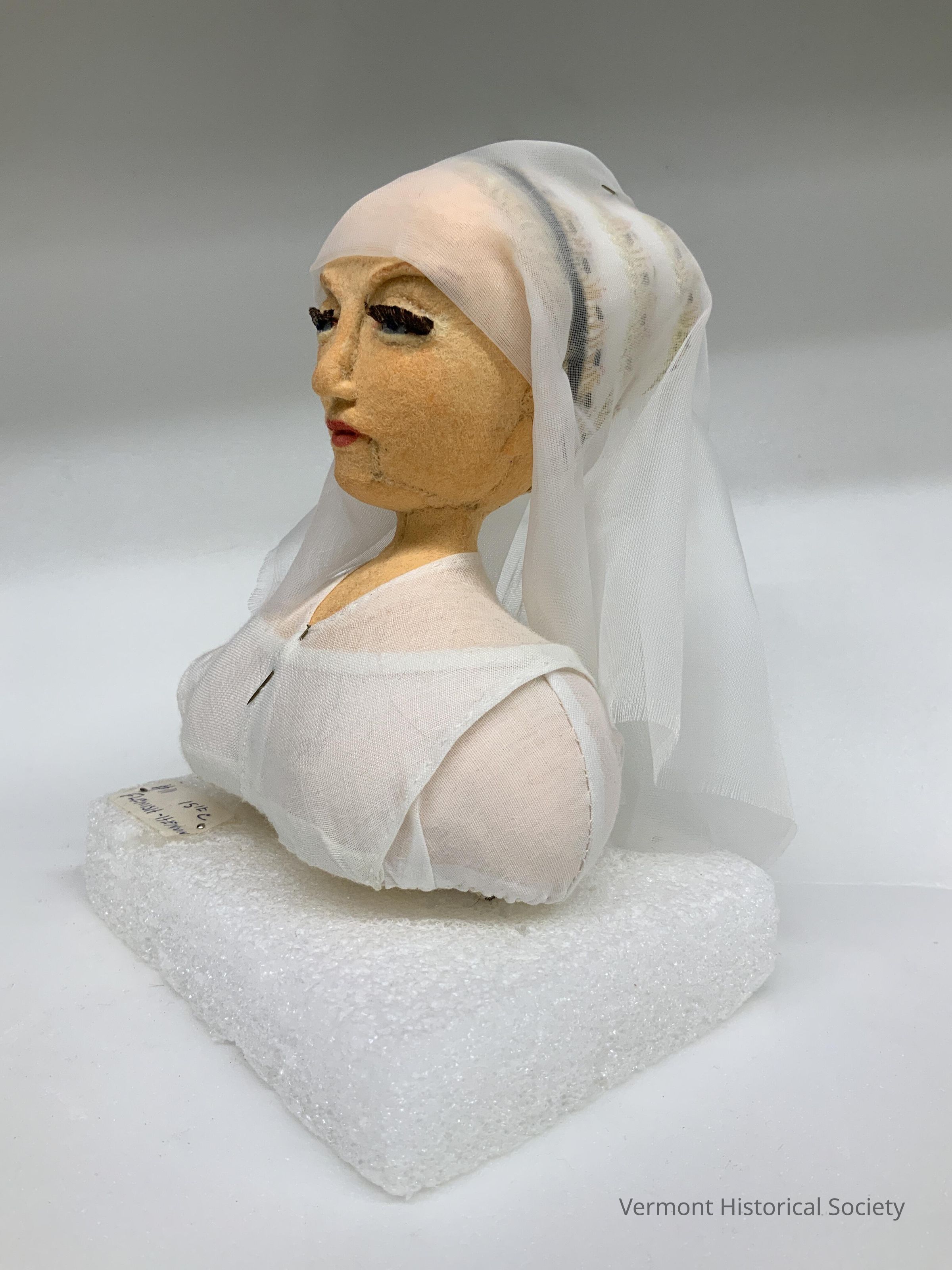 The bust is wearing a headdress consisting of sheer white fabric draped over a conical hat extending back from the head. The hat is framed with gold braid trim.