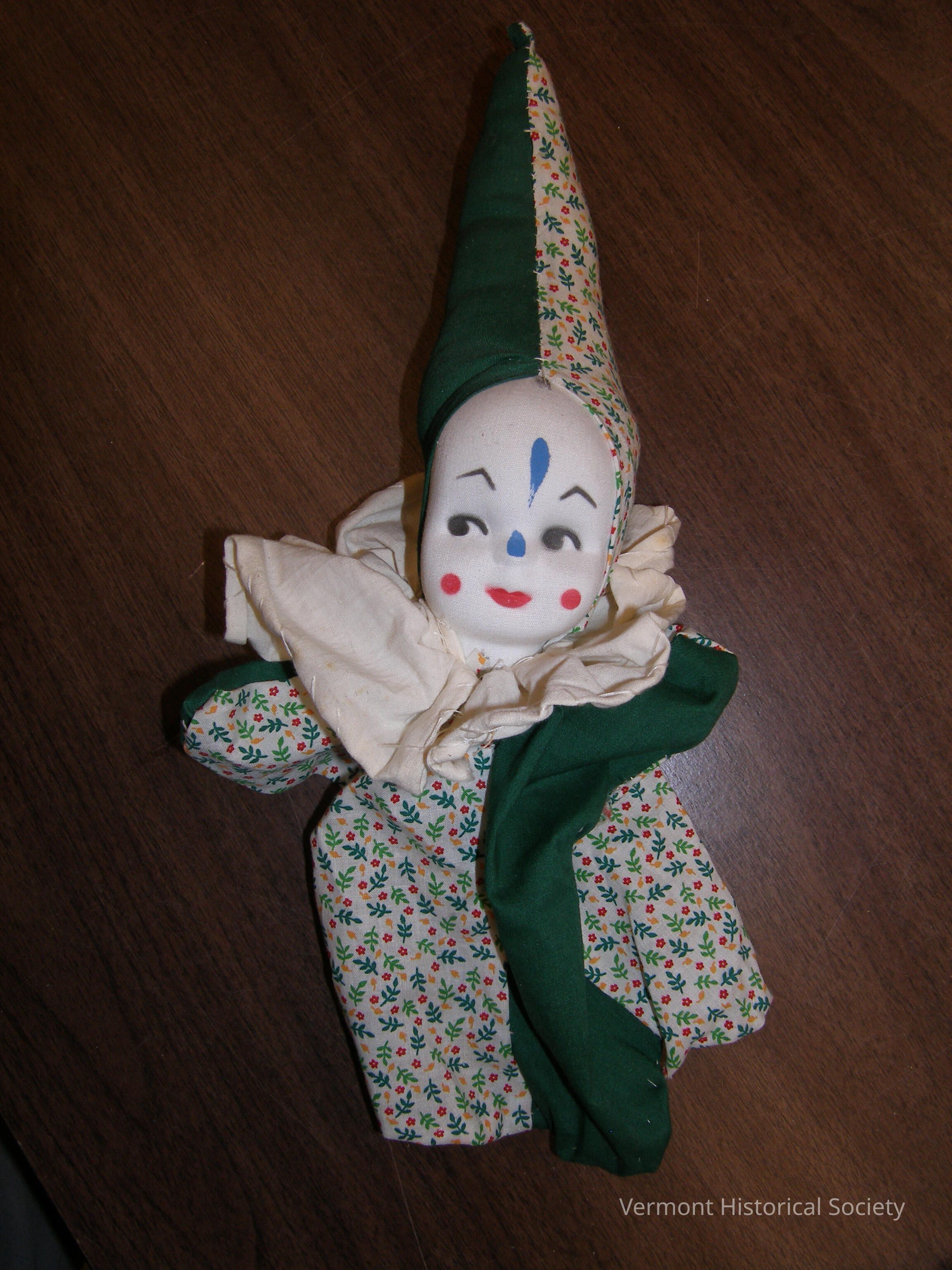 Clown puppet with a Styrofoam head. The body is made from alternating solid green cotton and white cotton sprigged with green and orange, as is the stuffed pointed hat. There is a white ruff around the neck. The face is painted with eyes, eyebrows, and a red mouth, along with two red dots on the cheeks and blue on the forehead and nose.Context