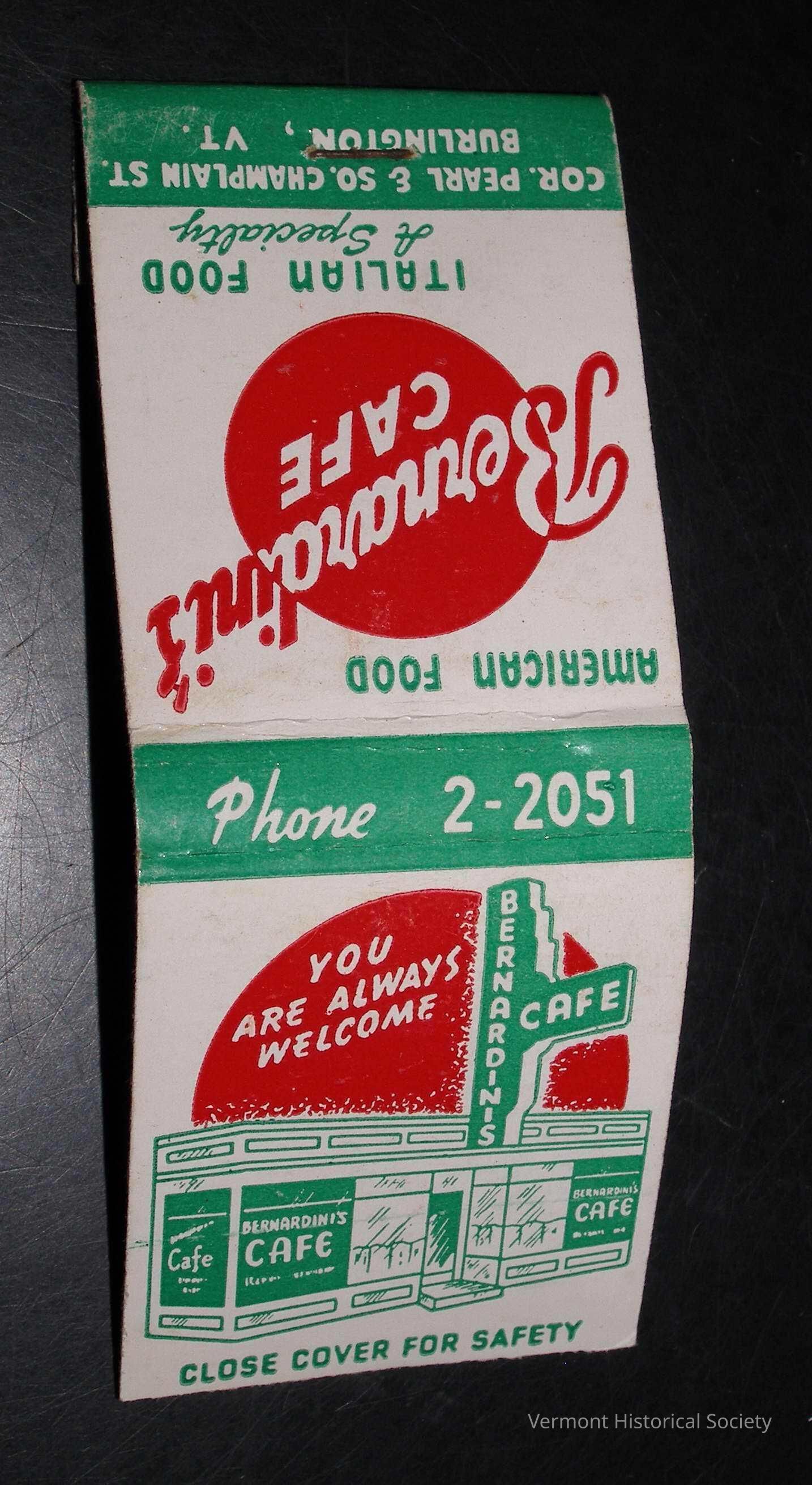This is a green, red, and white paper matchbook. On the front of the matchbook, it reads: "American Food / Bernardini's CAFE / Italian Food A Specialty / Cor. Pearl & So. Champlain St. Burlington, VT". On the other side, there is a line drawing of the cafe and its sign. Above the building is a solid red circle, which masks the lower 1/3 of the building, and the circle reads: "YOU ARE ALWAYS WELCOME". Inside the cover of the matchbook is Bernardini's motto, which states: "No one can please everyone--- but we try."Context