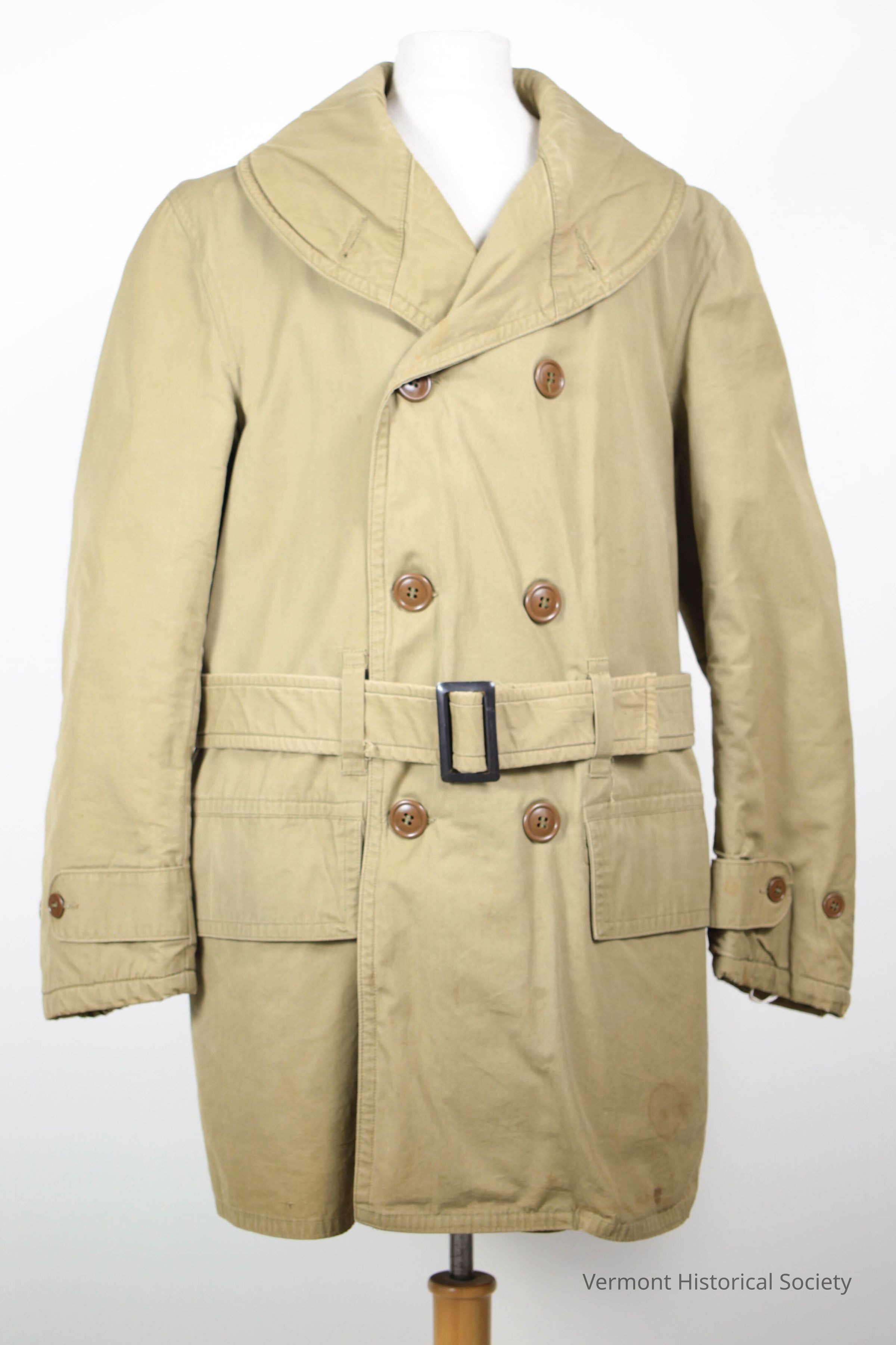 Tan canvas uniform coat flat-lined with heavy wool. The coat secures up the center front with two rows of brown plastic buttons. There is a wide, heavy collar. There are two buttons at the front hips. The width of the cuffs can be adjusted with a strap and buttons and there is a wool-lined belt that secures with a metal buckle at the wearer's waist. The upper left sleeve has two patches: a bar with the inscription "AIRBORNE", and a black circle with a yellow, four-towed talon (the insignia of the 17th Airborne).