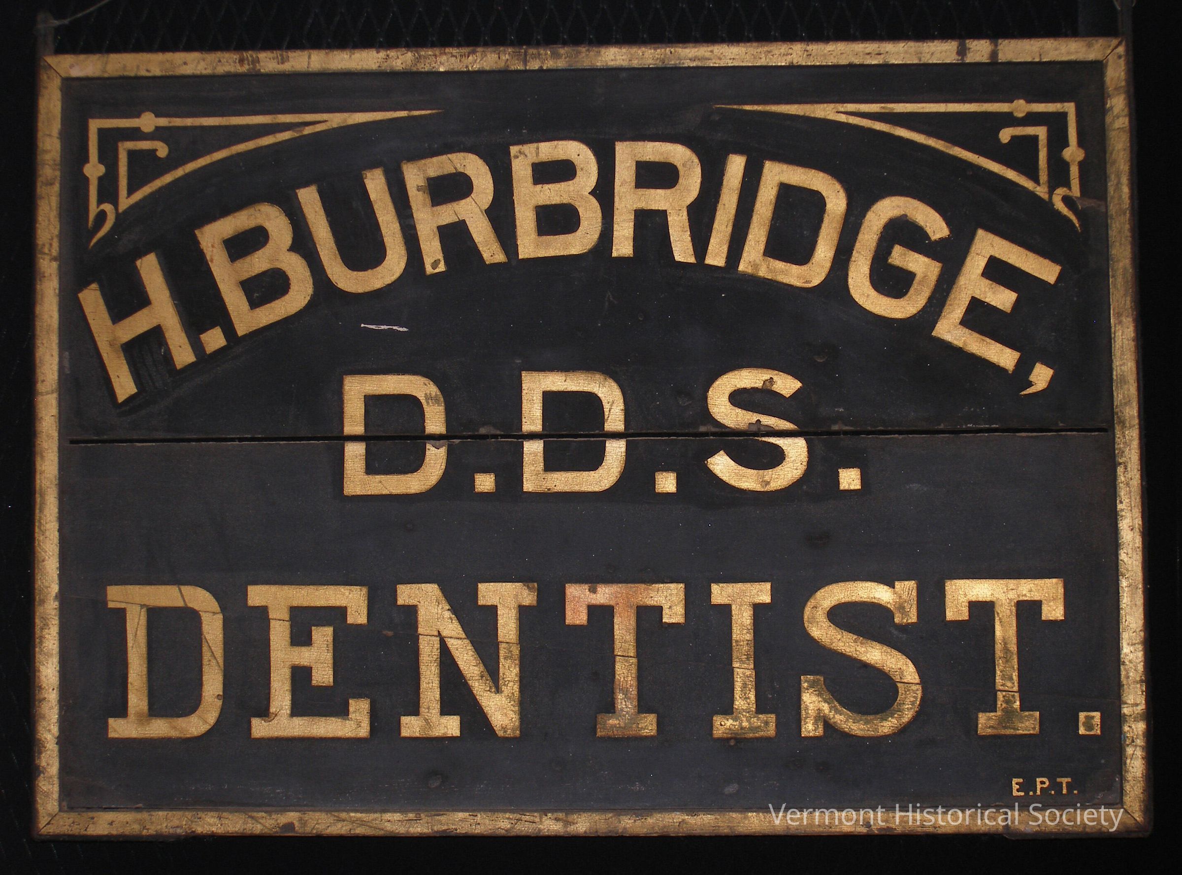Herman Burbridge practiced dentistry in Woodstock during the late 1890s and early 1900s. This wooden sign was a popular style during the late 1900s and is characterized by the sandpaper finish and gilt lettering. It was done by a professional sign painter, who we only know by his initials, EPT.