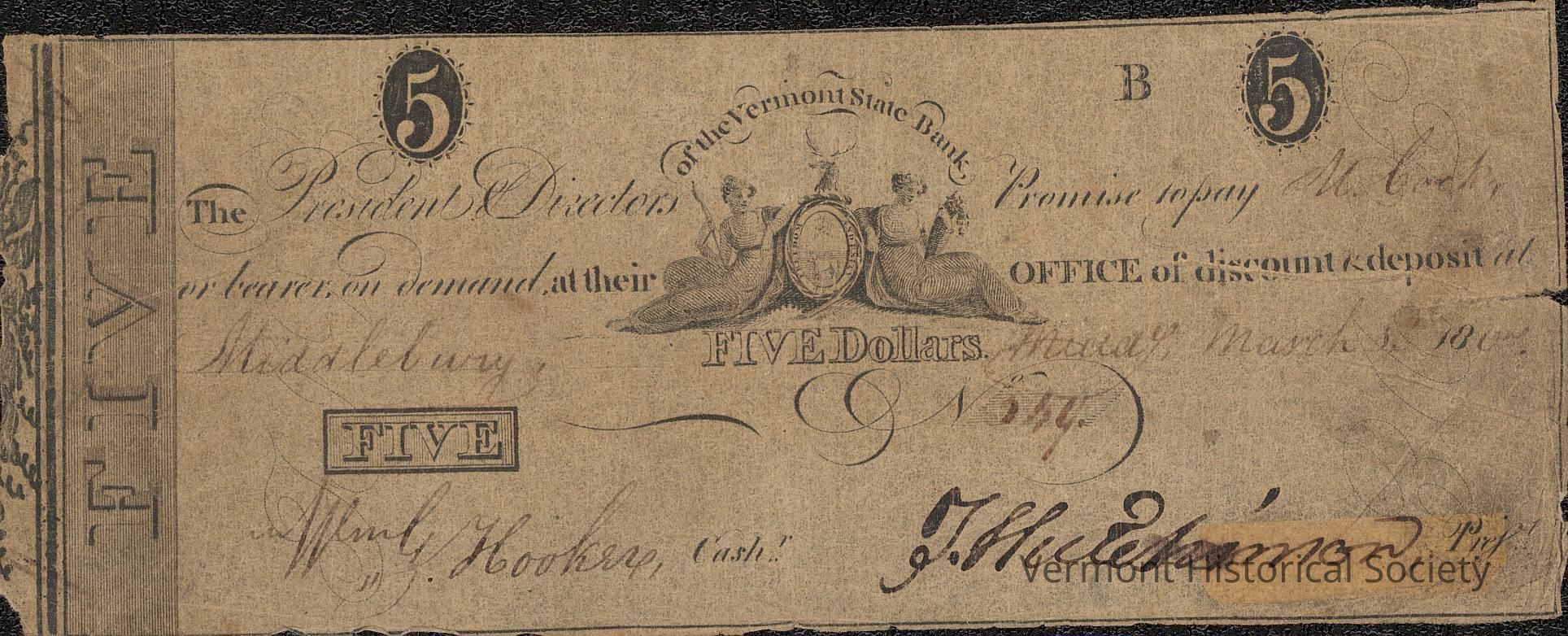 Private bank note for 5 dollars from The Vermont State Bank in Middlebury. It is made out to M. Cook (or bearer), and dated March 8th, 1802. The serial number 554. It is signed by Wm. G. Hooker (cashier) and T Hutchinson (president).Context