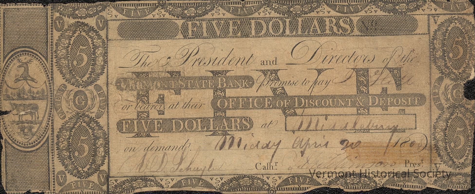 Private banknote for 5 dollars from Vermont State Bank in Middlebury, Vermont. It is dated April 20, 1808. It is made out to J. Hill and side by V. D. Schuyler and L. Williamson.
