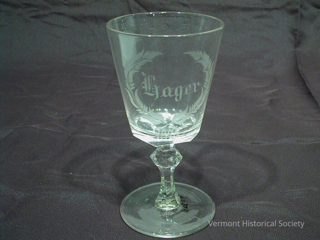Clear glass goblet etched on the cup with the name "Hager" within a wreath.