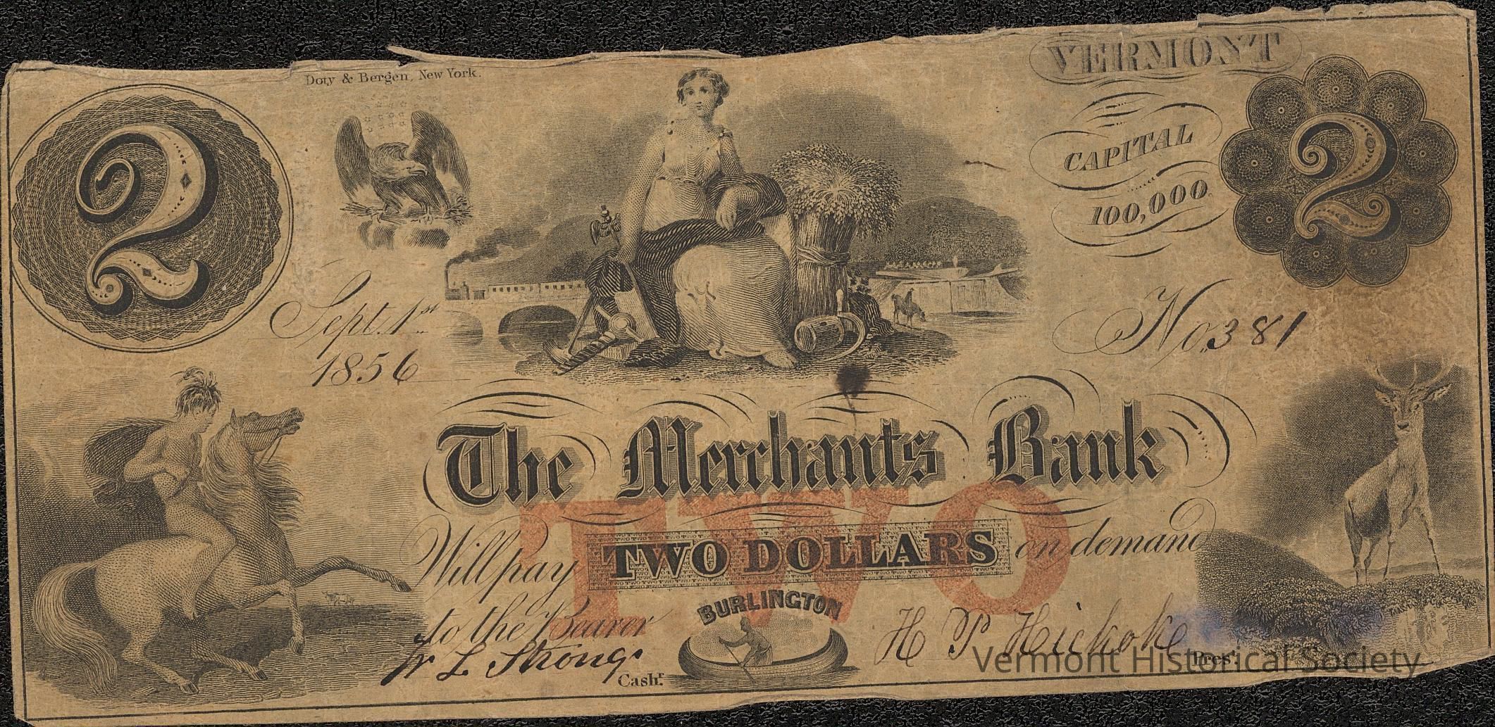 Private banknote for 2 dollars from the Merchants Bank in Burlington, Vermont. It is dates Sept. 1st, 1856. The serial number is 381. It is signed by W. L. Strong (cashier) and H. P. Hickok (president).Acquisition