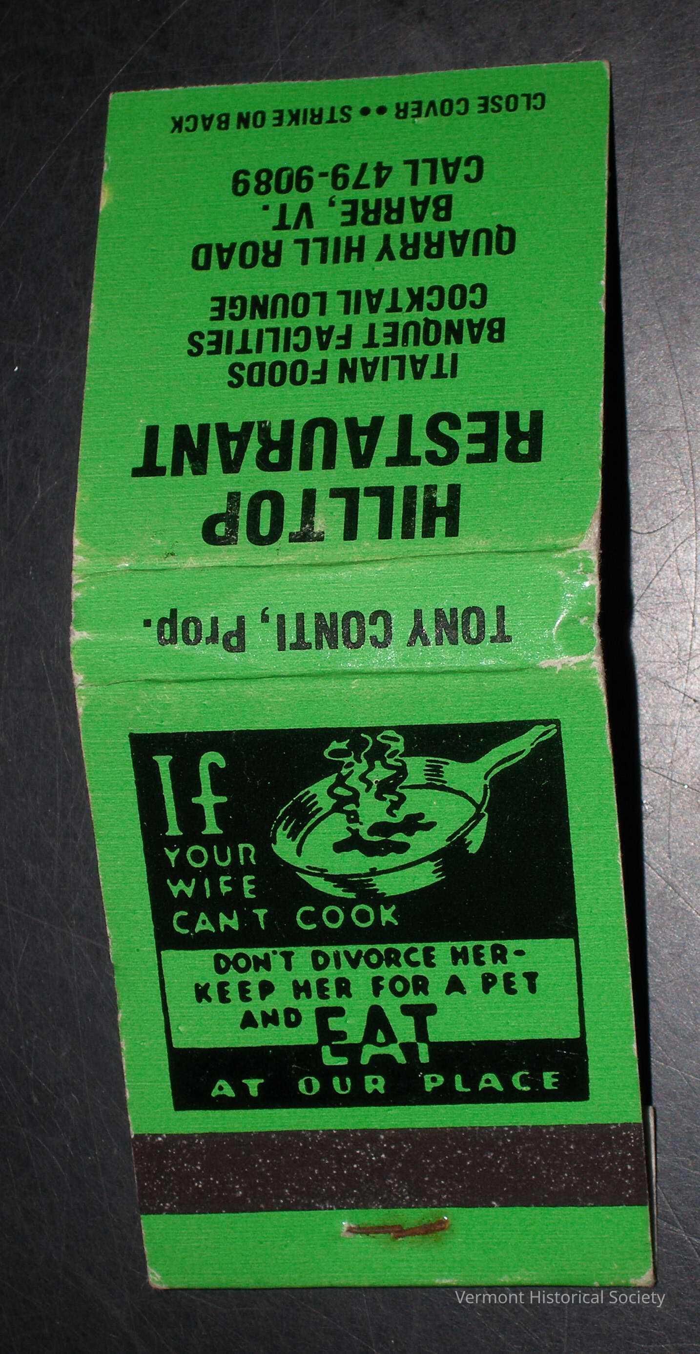 The item is a green matchbook printed in black with the following information: "HILLTOP RESTAURANT ITALIAN FOODS BANQUET FACILITIES COCTAIL LOUNGE QUARRY HILL ROAD BARRE VT. CALL 479-9089" on the front. It also states "CLOSE COVER ** STRIKE ON BACK."