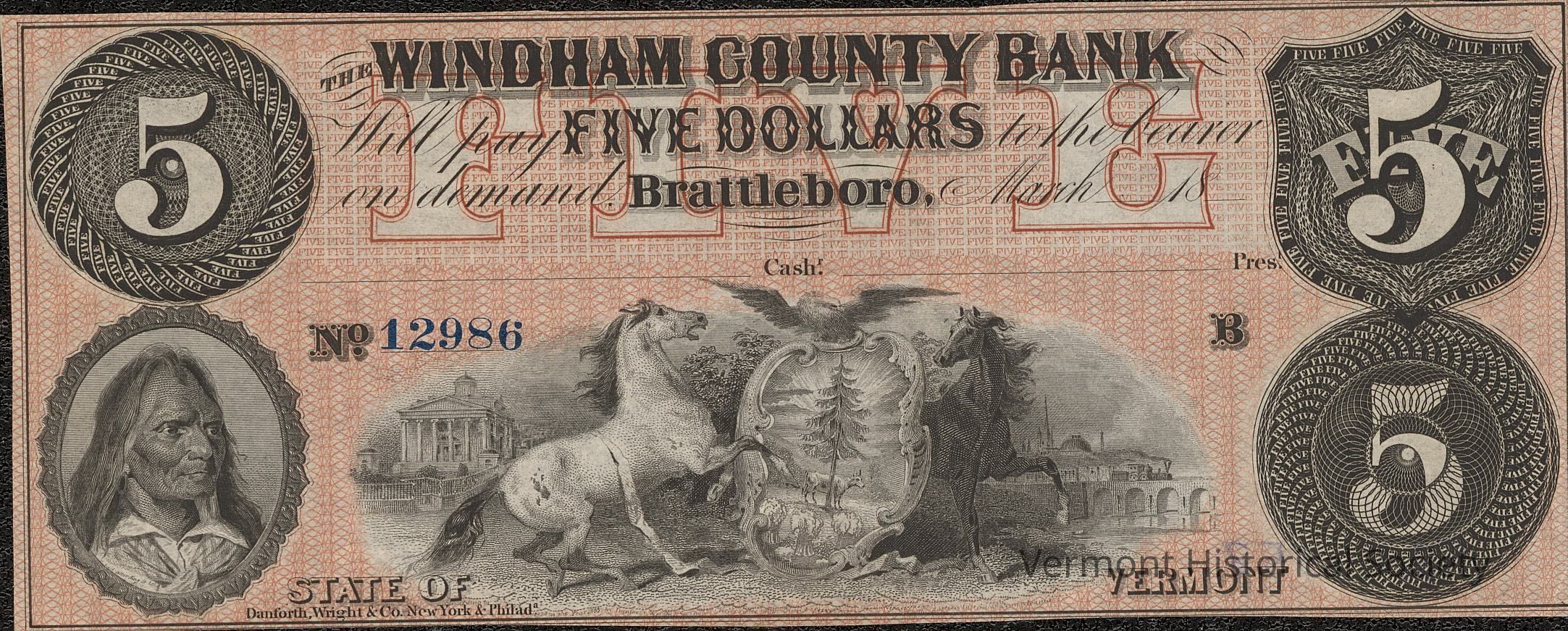 Private banknote for 5 dollars from The Windham County Bank in Brattleboro, Vermont. The serial number is 12986. It is dated March [blank] 18[blank]. The lines for cashier and president are unsigned.
