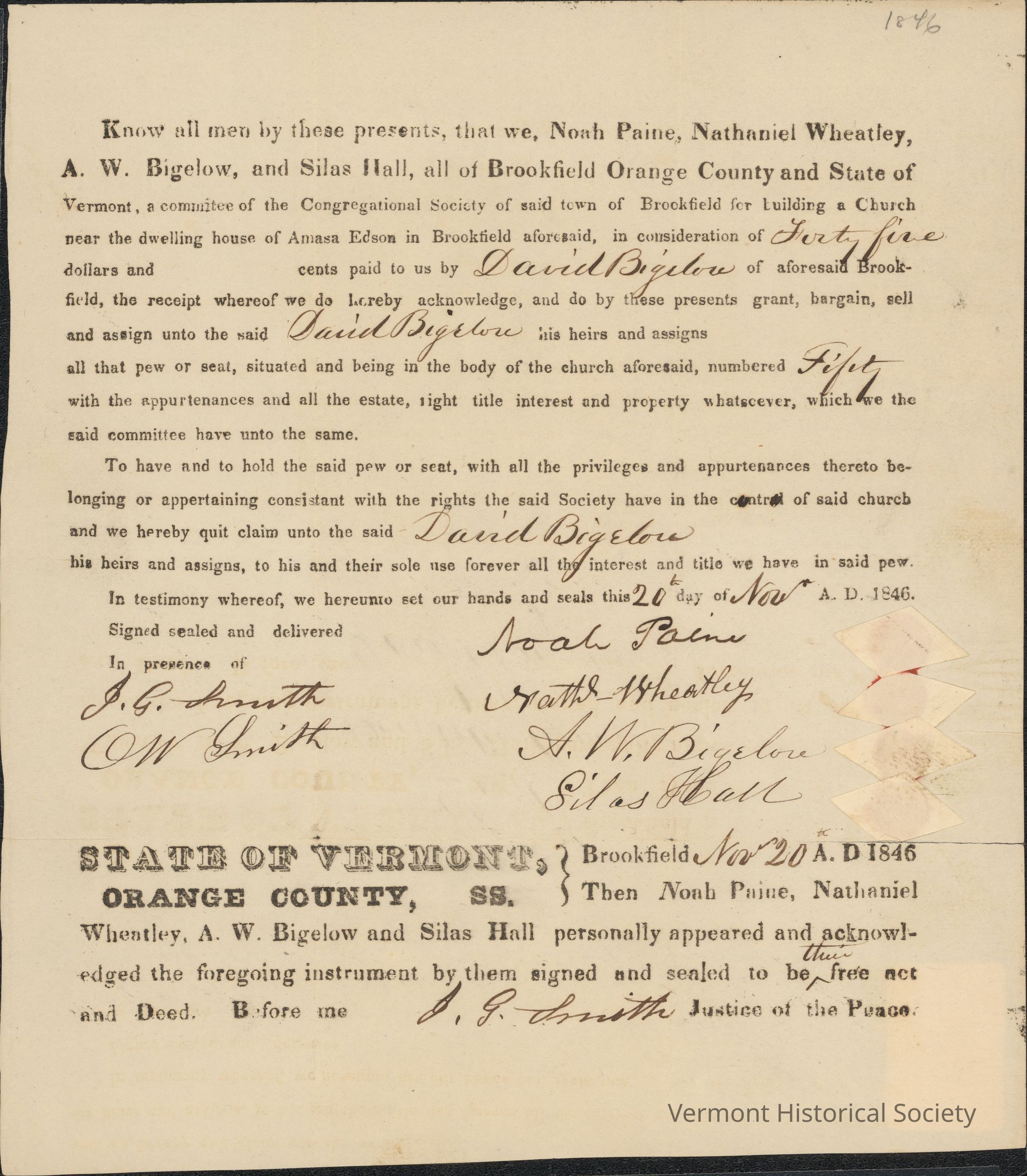 Document detailing a financial commitment to a family pew at a Congregational church in Brookfield.
