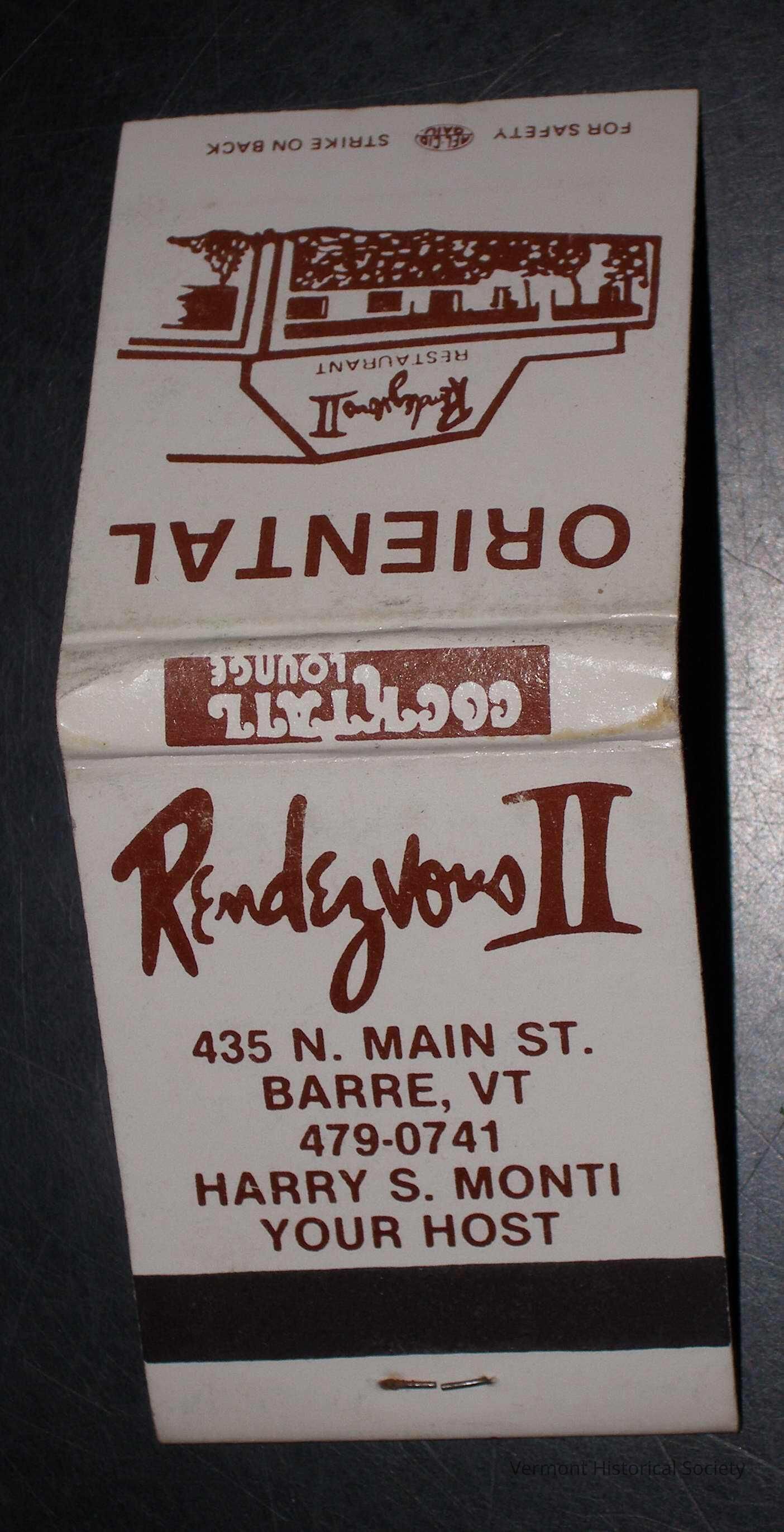 White cardboard matchbook printed in brown with a line drawing of a building and the label "ORIENTAL" on the front. The label, "Rendezvous II 435 N. MAIN ST. BARRE, VT 479-0741 HARRY S. MONTI YOUR HOST" is printed on the back. "COCKTAIL LOUNGE" is printed on the edge.Context