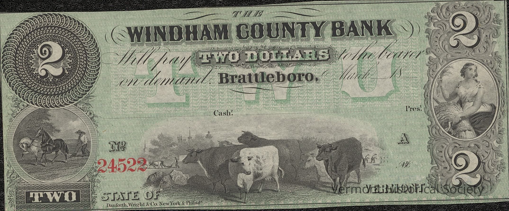 Private banknote for 2 dollars from The Windham County Bank in Brattleboro, Vermont. It is unsigned. The serial number is 24522.