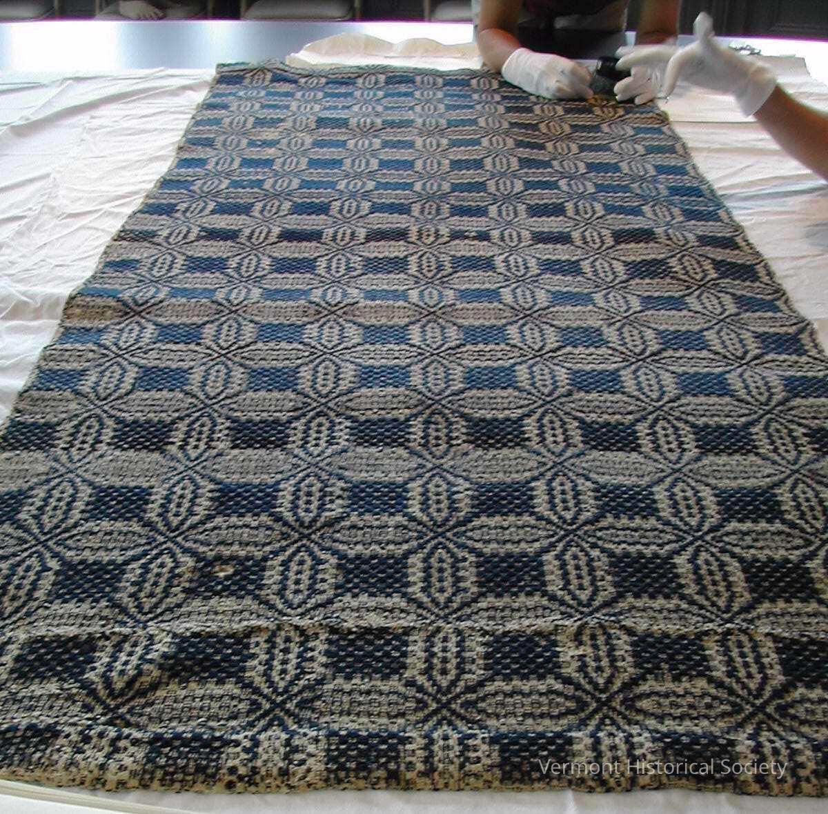 Panel of a blue-and-white overshot coverlet in the orange peel pattern.