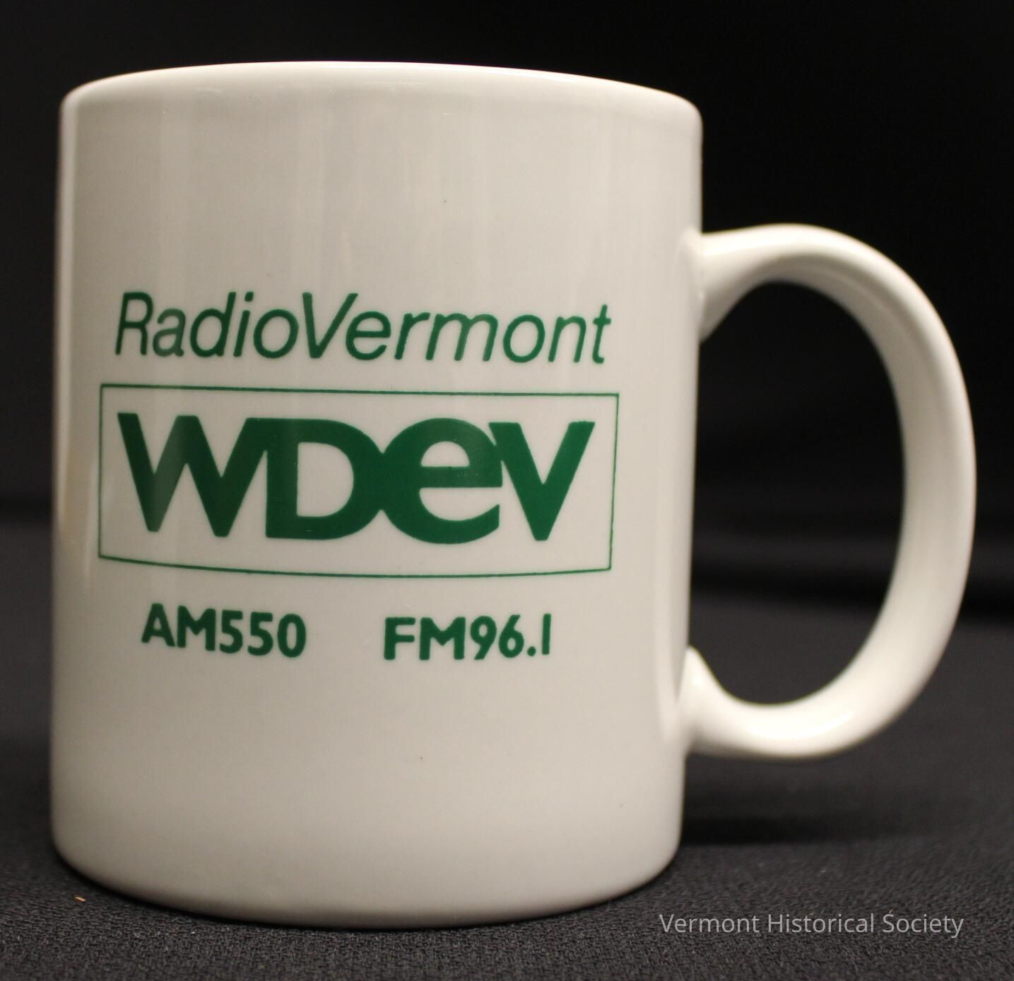 Straight-sided white ceramic mug with the green inscription "RadioVermont WDEV AM550 FM96.1" on one side and "Radio You Can Count on Since 1931" on the other side.
