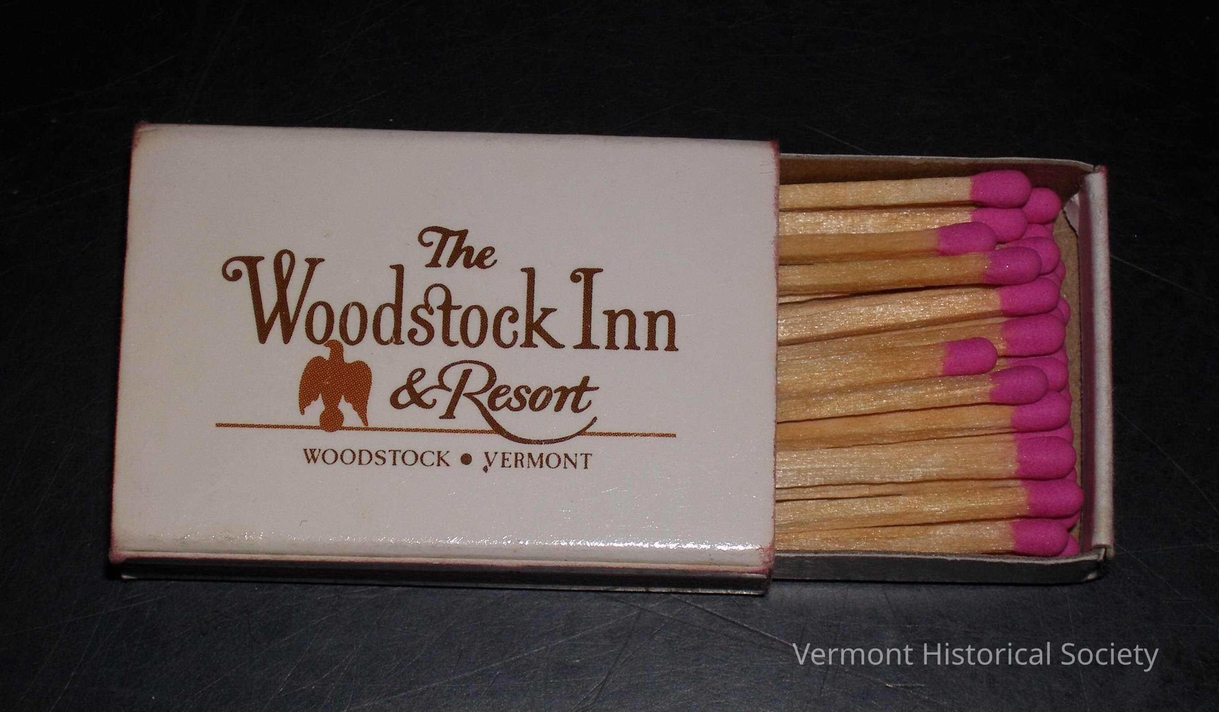 Cardboard matchbox filled with pink-headed matches. The box is printed with an image of a bird and the words, "The Woodstock Inn & Resort WOODSTOCK VERMONT". The side of the box is printed with, "802-457-11-- RES: 1-899-448-7900". There is a scratch strip for lighting the matches on the opposite side.Context