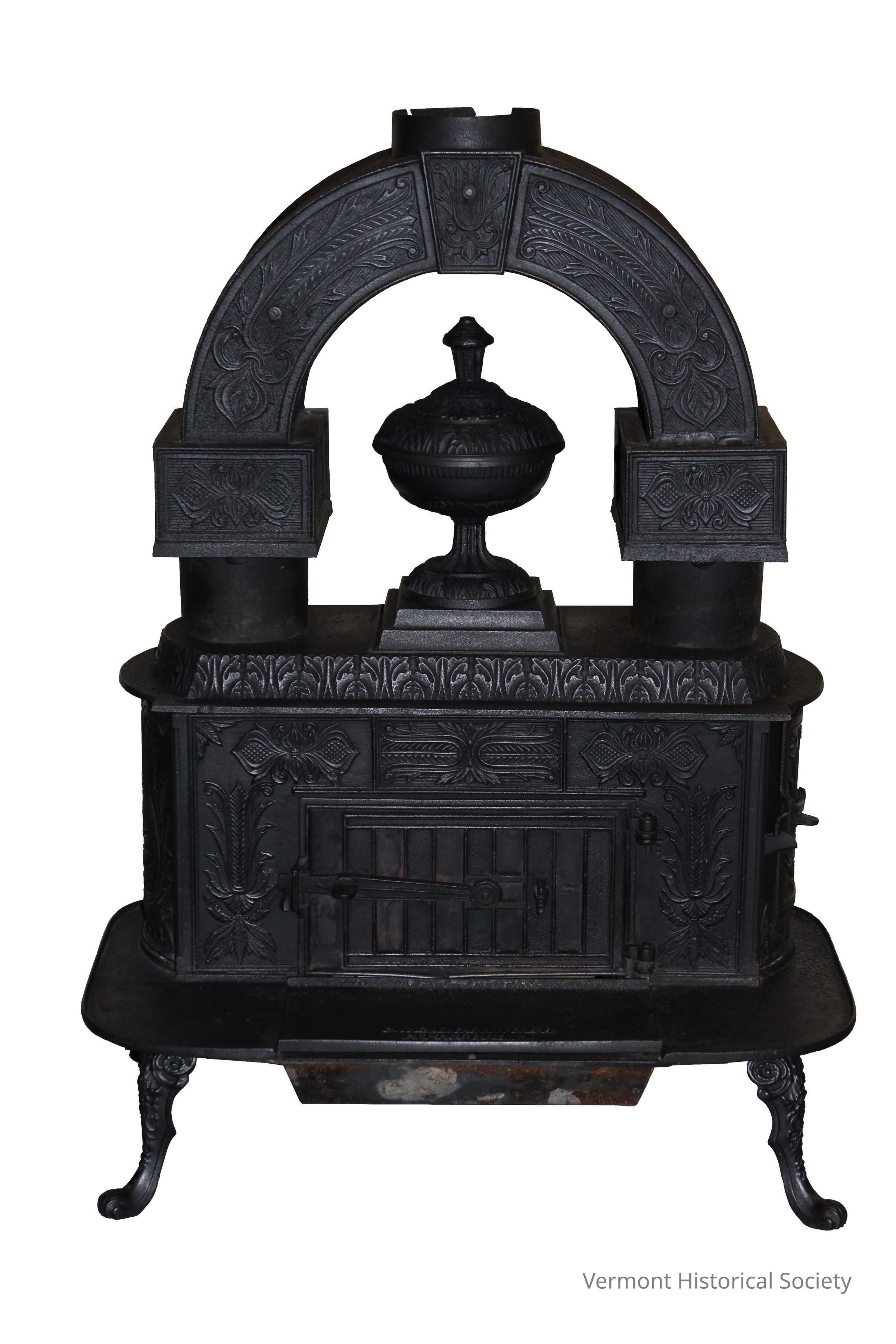 Iron furnaces and foundries that manufactured stoves, tools, and all manner of hardware flourished in Vermont during the first half of the nineteenth century. In addition to Pittsford, large operations prospered in the Forestdale section of Brandon, the village of Tyson in Plymouth, and Poultney. Stylish stoves such as this one are the primary survivors from this era when whole villages grew up around the iron industry.