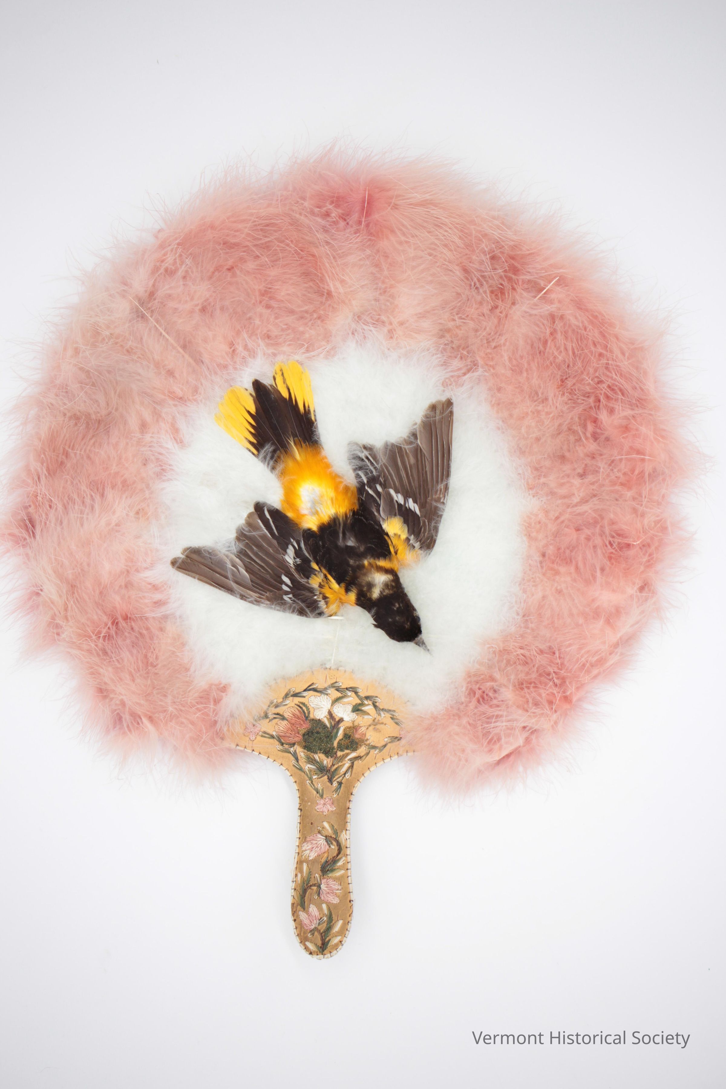 This unusual artifact, at least to present day observers, seems barbaric. When it was made in the 1850s it was a souvenir. What we know about it is written in pencil on the lid of its custom-made box. The inscription reads, "bought at Niagara Falls 1858 by Mrs. Wm. Billings. Made by the Indians. Presented to Blanch C. Fisher, Randolph, Vt. by Mrs. Wm Billings Jan 22 1910 as a birthday present". Who were Mrs. William Billings and Blanch Fisher? At present we don't know. The quillwork and birch bark handle is of a type made by the indigenous peoples of the Northeastern part of North America (In particular New York or Canada). Pieces like this, as well as boxes and baskets, would have been sold at Niagara Falls, a popular tourist attraction even in the 1850s.