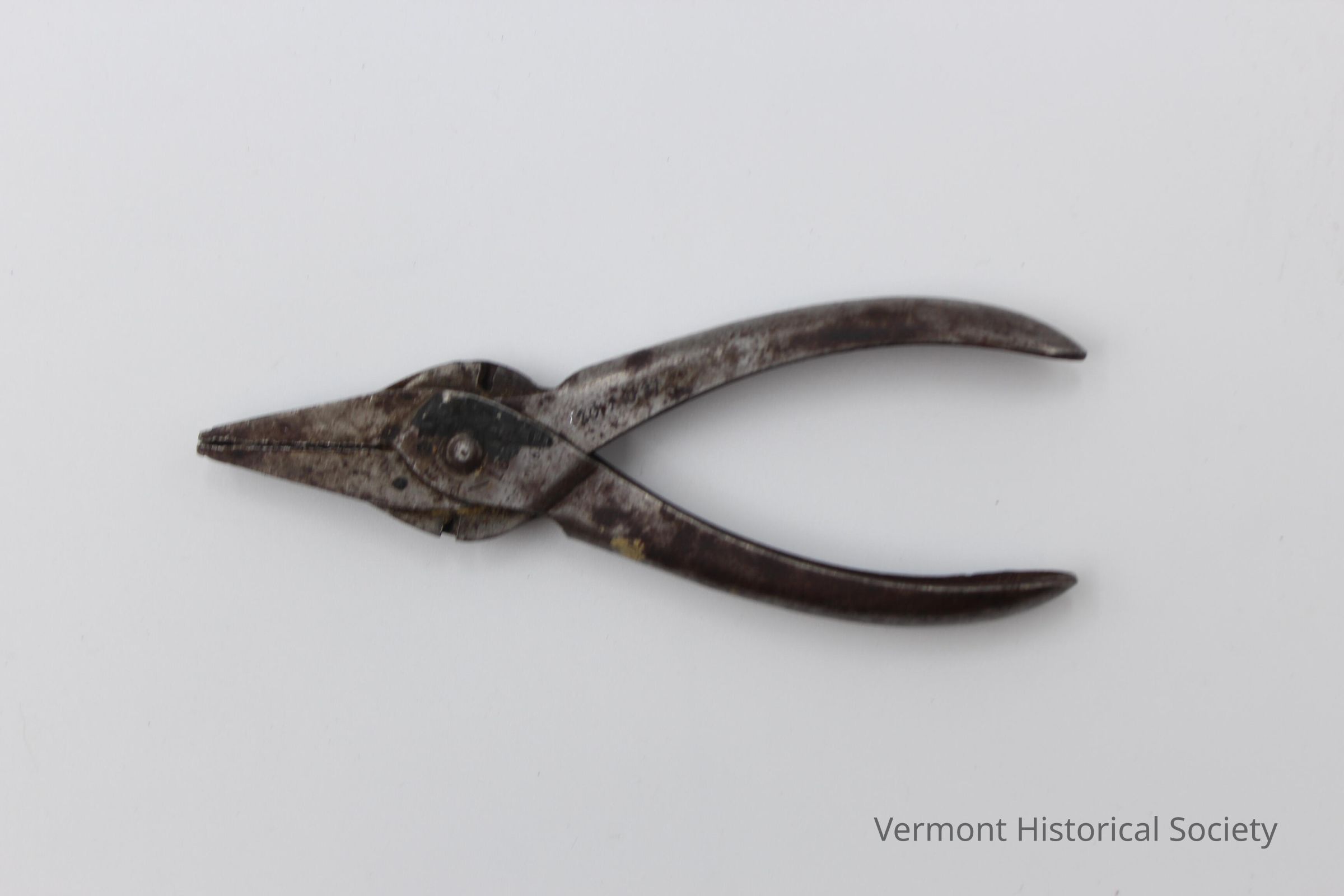 Flatnose metal pliers. The ridges on the inside of the pliers' nose have warn away. There is a manufacturer's mark, but it is illegible. On either side of the mechanism for opening and closing are two cutouts which align when the pliers are opened part way.Context