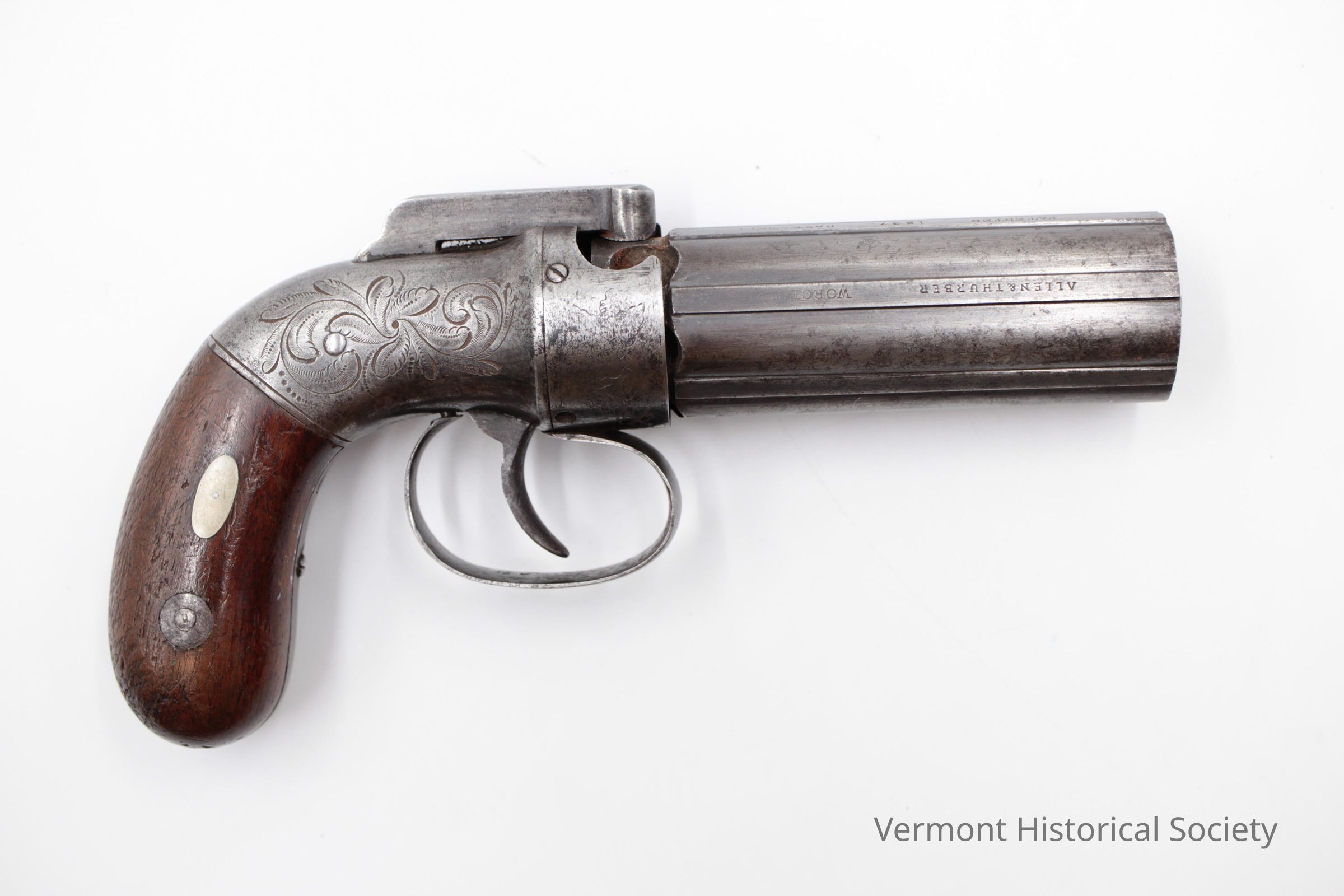 Double-action pepperbox revolver with six chambers in its steel cylinder. All the barrels are smooth bore and are cap fired. The barrel and lock are engraved with vines. It has "Allen and Thurber Worcester" and "Patented 1837 Cast Steel" on the cylinder. The pins that hold the grip in place have brass washers.