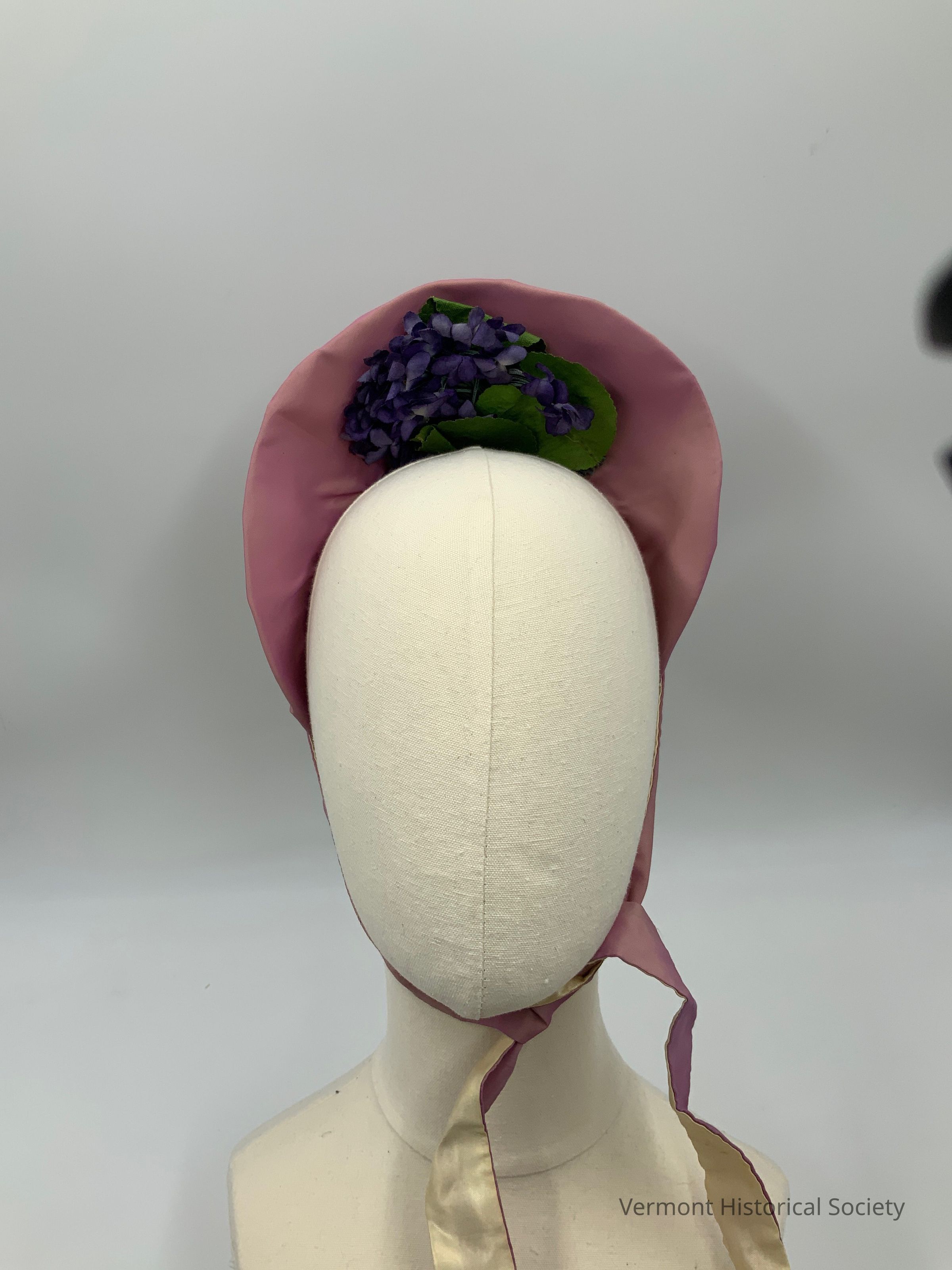 Small hat or bonnet consisting of a short, upward facing brim and a closely-fitted crown. Both the interior and exterior are covered with pink/purple shot silk taffeta. The interior of the brim is decorated with purple silk flowers and green silk leaves. There are two lengths of fabric to act as ties; they are self fabric on one side, and cream-colored silk satin on the other side.Context