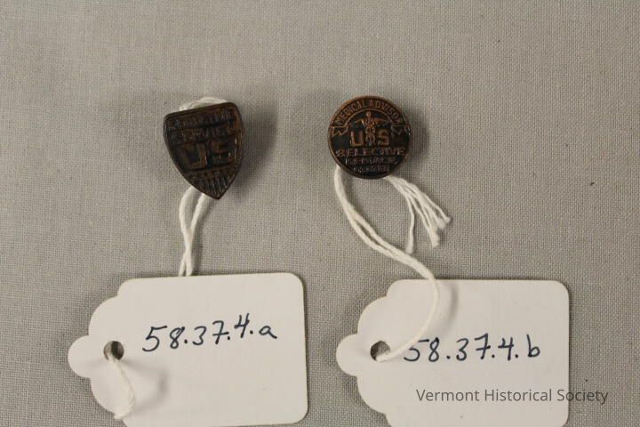 Two Selective Service pins, one in the shape of a shield and one a circle. The shield-shaped pin is molded with the inscription, "SELECTIVE SERVICE US". The circle is molded with a caduceus and the inscription, "MEDICAL ADVISOR U S SELECTIVE SERVICE".