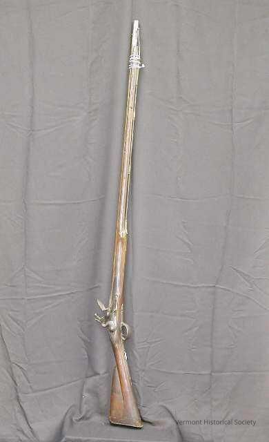 Long-barreled flintlock musket. The firing hardware is marked, "TOWER", behind the hammer, and "GR" beneath a crown in front of the hammer. The barrel is marked, "IW".