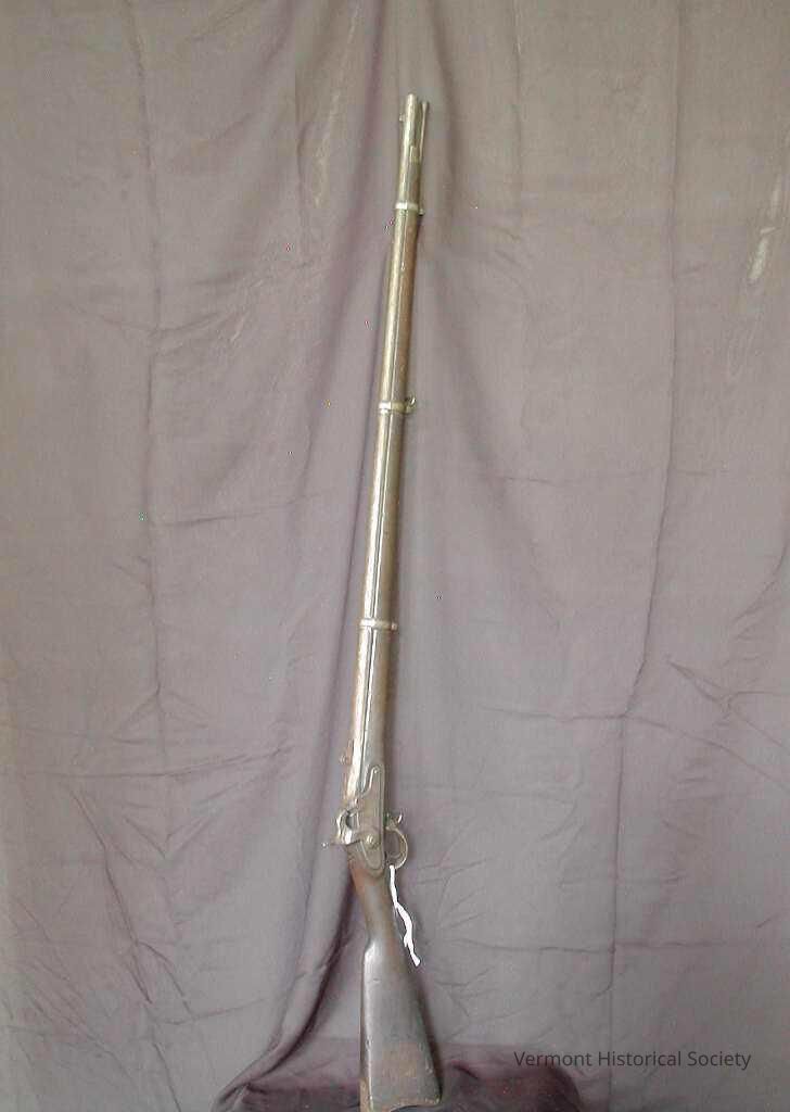 Springfield Model 1863 long-barreled musket. The lock plate is marked, "1863 / S.N. & W.T.C. 4 MASSACHUSETTS 1863". The barrel is marked "1864 / 7 VP / LFR". The number 58 is incised into the wood behind the hammer.