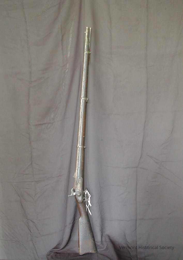 Springfield Model 1863 long-barreled musket. The lock plate is marked, "1863 / S.N. & W.T.C. FOR MASSACHUSETTS 1863". The barrel is marked "1864 / 7 VP / LFR". The number 72 is incised into the wood behind the hammer.